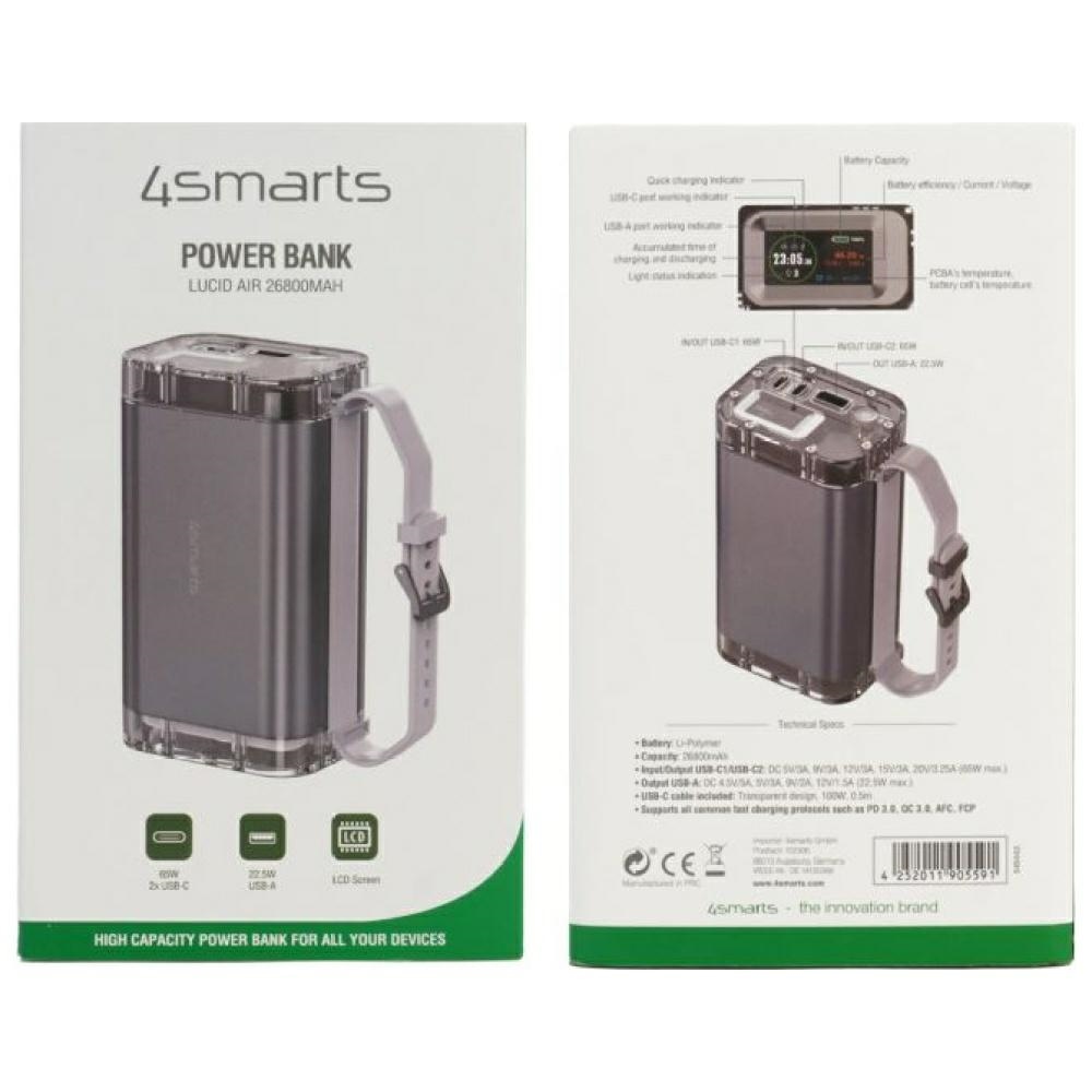 A Lucid Air powerbank egy hatékony külső akkumulátor, amely számos eszköz, például laptopok, tabletek és okostelefonok töltésére használható. 26800 mAh kapacitásával legalább egyszer teljesen feltöltheti MacBookját, valamint többször is feltöltheti tabletjeit és okostelefonjait. Az ilyen kapacitásnak köszönhetően repülőgépre is magával viheti, ami ideális utazótárssá teszi. Az általunk kínált powerbank rendkívül strapabíró, a leejtésállósági teszteken is megállta a helyét. Az egy méteres magasságból történő esések sem befolyásolták a powerbank működését. Szolid házának köszönhetően ütésálló, és ellenáll a károsodásoknak. Az IP67 tanúsítvány garantálja a víz, por és szennyeződés elleni védelmet. 65 W teljesítményű, Power Delivery funkcióval, 1 USB-A és 2 USB-C porttal rendelkezik. LCD kijelzője valós időben mutatja az információkat, mint például a feszültség, a bevitel és kimenet teljesítménye, valamint az áramerősség. A powerbank könnyű és hordozható, és tartalmaz egy fél méter hosszú USB-C kábelt is.
