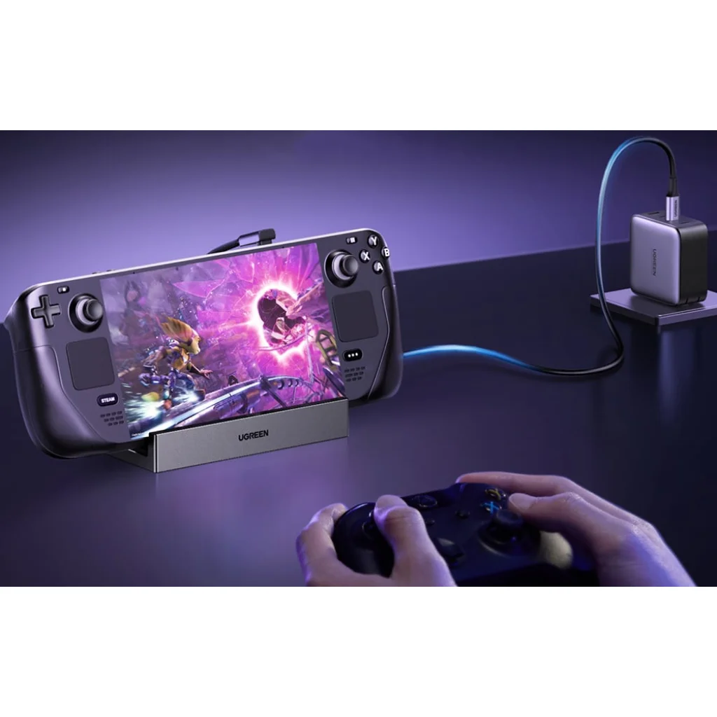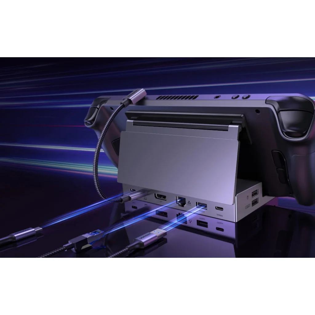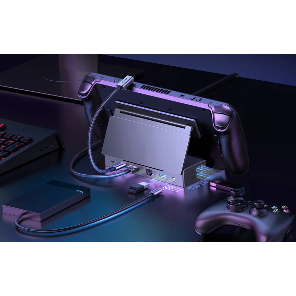 Az adapter kialakítása összecsukható és 180°-ig állítható, így kényelmesen a megfelelő szögben helyezheti el a készüléket. A csúszásmentes szilikon fokozza a stabilitást, az okos kialakítás pedig nem akadályozza a szellőzőnyílásokat, például a Steam Deckben. További bónusz a levehető USB-C kábel, amely megkönnyíti a szállítást és az asztali hely rendezését.