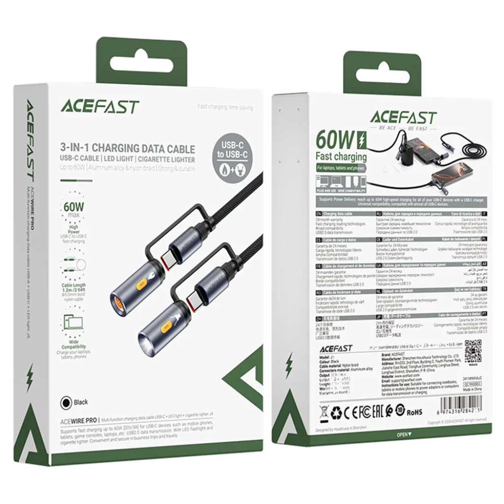 Az Acefast J4 adatkábel nem csupán egy egyszerű töltő- és adatkábel, hanem egy innovatív, 3 az 1-ben megoldás, amely a modern USB-C eszközök felhasználóinak igényeit hivatott kielégíteni. Felejtse el a több kábel és kiegészítő cipelését! Ez a strapabíró, 1.2 méteres, fekete kábel beépített LED zseblámpával és elektromos cigarettagyújtóval is rendelkezik, így minden helyzetben kéznél van a segítség, legyen szó gyors töltésről, adatátvitelről, vagy egy váratlan fényforrásról.