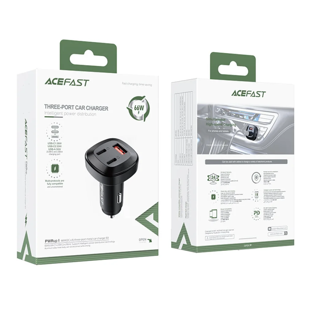 Acefast autós gyorstöltő. 2 USB Type C és 1 USB portja van. Az USB Type C csatlakozók 36W és 30W-os töltést tesznek lehetővé, együtt akár 66W terhelést is kibírnak. Lehetővé teszi a gyors töltést, többek között PPS, Power Delivery, Quick Charge 4.0, AFC és FCP szabványokban. Egyszerre 3 készülékhez csatlakoztatható. Tűzálló PC anyagból készült. Számos védelemmel van ellátva, mint például túlmelegedés, túlfeszültség, nagyfeszültség vagy túlterhelés.