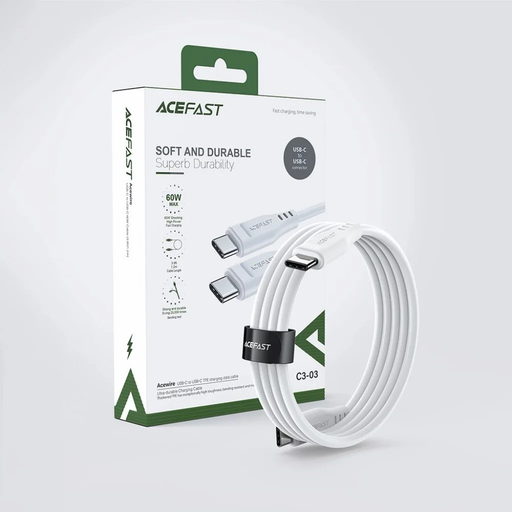 Acefast kábel USB Type C - USB Type C 1.2m, 60W (20V/3A) (C3-03) USB Type C - USB Type C kábel töltésre és adatátvitelre az Acefast-től. USB Type C csatlakozóval rendelkező eszközökhöz van tervezve. Hossza 120 cm, és 60W és 3A árammal üzemelhet. Lehetővé teszi a gyors töltést a Power Delivery technológia használatával. Használható USB Type C csatlakozóval rendelkező noteszgépek táplálására, amelyeknek akár 60W teljesítményre van szükségük (ellenőrizze a laptop specifikációit).