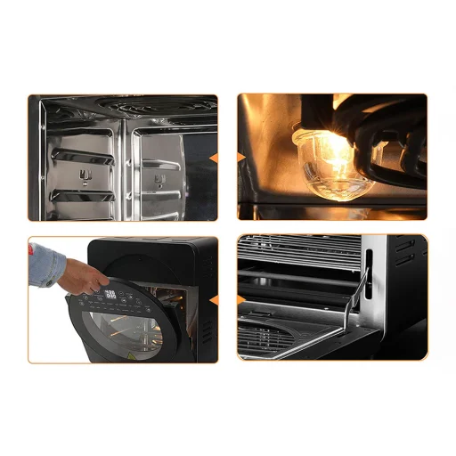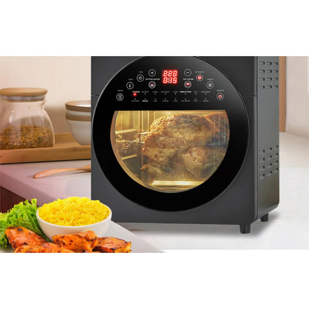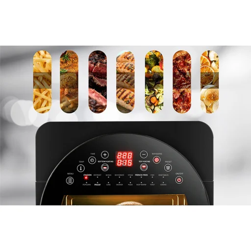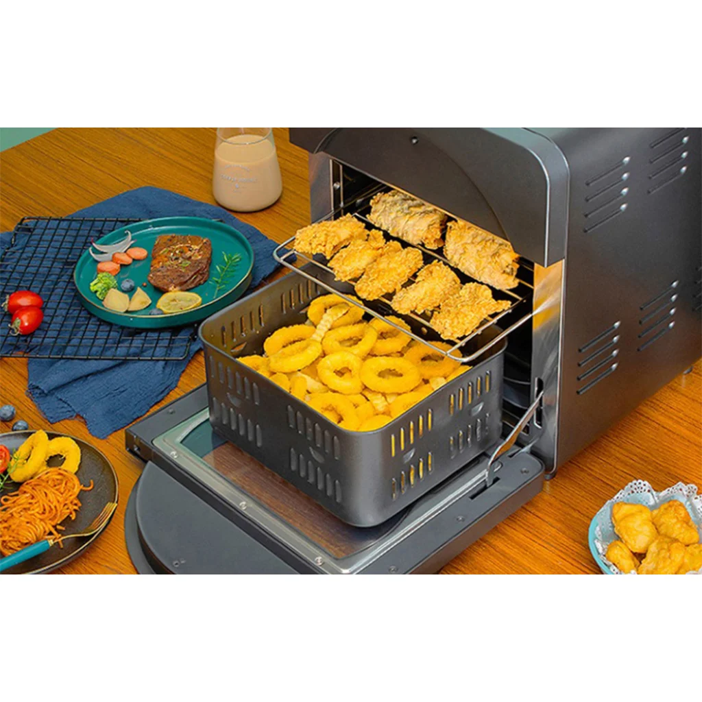 Az Air Fryer nemcsak funkcionalitásával, hanem gondosan átgondolt designjával is lenyűgöz. Nagy ablakkal van felszerelve, amely lehetővé teszi a sütési folyamat nyomon követését anélkül, hogy fel kellene nyitnia a fedelet. Kapacitása eléri a 14 litert - így nem kell aggódnia a helyhiány miatt vagy a részenkénti sütés szükségességétől - az Air Fryer mindent elhelyez, amire szüksége van. A beépített kijelző megkönnyíti az eszköz használatát. Segítségével könnyedén beállíthatja az időt vagy a hőmérsékletet, valamint módosíthatja a főzési módot. Emellett könnyedén tisztítható.