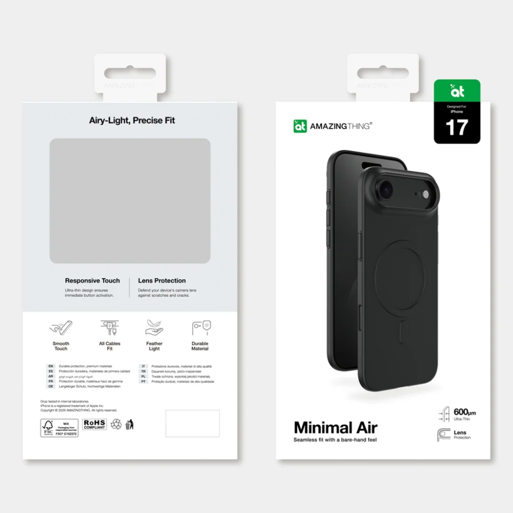 Az AmazingThing Minimal Air tok tökéletes választás azok számára, akik szeretnék megvédeni telefonjukat, miközben megőrzik annak karcsú és elegáns megjelenését. Az ultra-vékony kialakítás, amely mindössze 600 mikrométer vastag, szinte észrevehetetlenné teszi a tokot kézben tartva. Könnyű és sima felülete kényelmes használatot biztosít, míg a kamera lencséjét körülvevő megemelt szélek védelmet nyújtanak a karcolásokkal és repedésekkel szemben. A tok kompatibilis a MagSafe kiegészítőkkel, és könnyű hozzáférést biztosít minden kábelhez. Emellett a telefon gombjai teljesen reakcióképesek maradnak, lehetővé téve a gyors és kényelmes használatot.