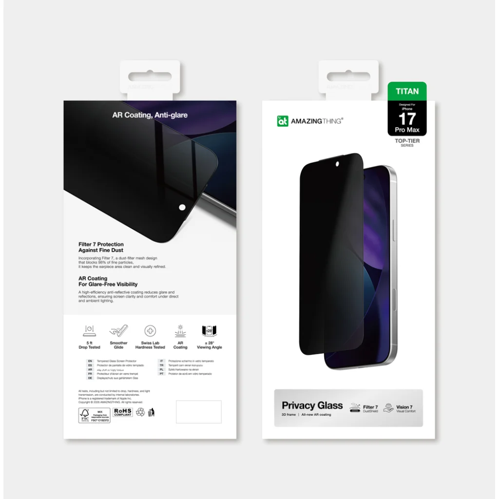 AmazingThing Titan Vision 7 Üvegfólia iPhone 17 Pro Max Privacy Az AmazingThing Titan Vision 7 Privacy üvegfólia megvédi telefonod adatainak biztonságát és kényelmét. Korlátozza a képernyő látószögét ±28°-ra, így az adataid rejtve maradnak a kíváncsi tekintetek elől. Az AR tükröződésmentes bevonat csökkenti a ragyogást, a Filter 7 porvédő pedig megakadályozza, hogy a por bejusson a hangszóróba. Az öt rétegű szerkezet növeli az ellenállást a sérülésekkel szemben és kényelmes, sima érintést biztosít. Tökéletes üveg azok számára, akik értékelik a privát szférát, esztétikát és tartós védelmet. ~ Műszaki jellemzők:- Márka: AmazingThing