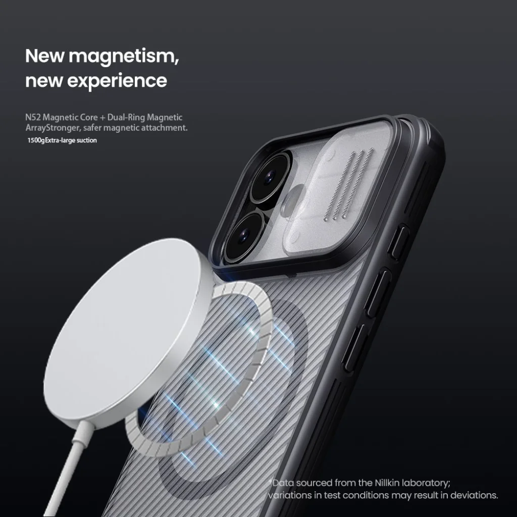 Ez a CamShield PRO változat beépített mágnessel rendelkezik, amely új szintre emeli a MagSafe kompatibilitást és a kényelmet. Az N52 mágneses mag és a kettős gyűrűs mágneses elrendezés révén a tok erősebb és biztonságosabb mágneses rögzítést biztosít. Akár 1500g extra szívóerővel tartja magát a MagSafe töltőkhöz és egyéb mágneses kiegészítőkhöz, így garantálva a stabil és hatékony vezeték nélküli töltést, valamint a kényelmes használatot.