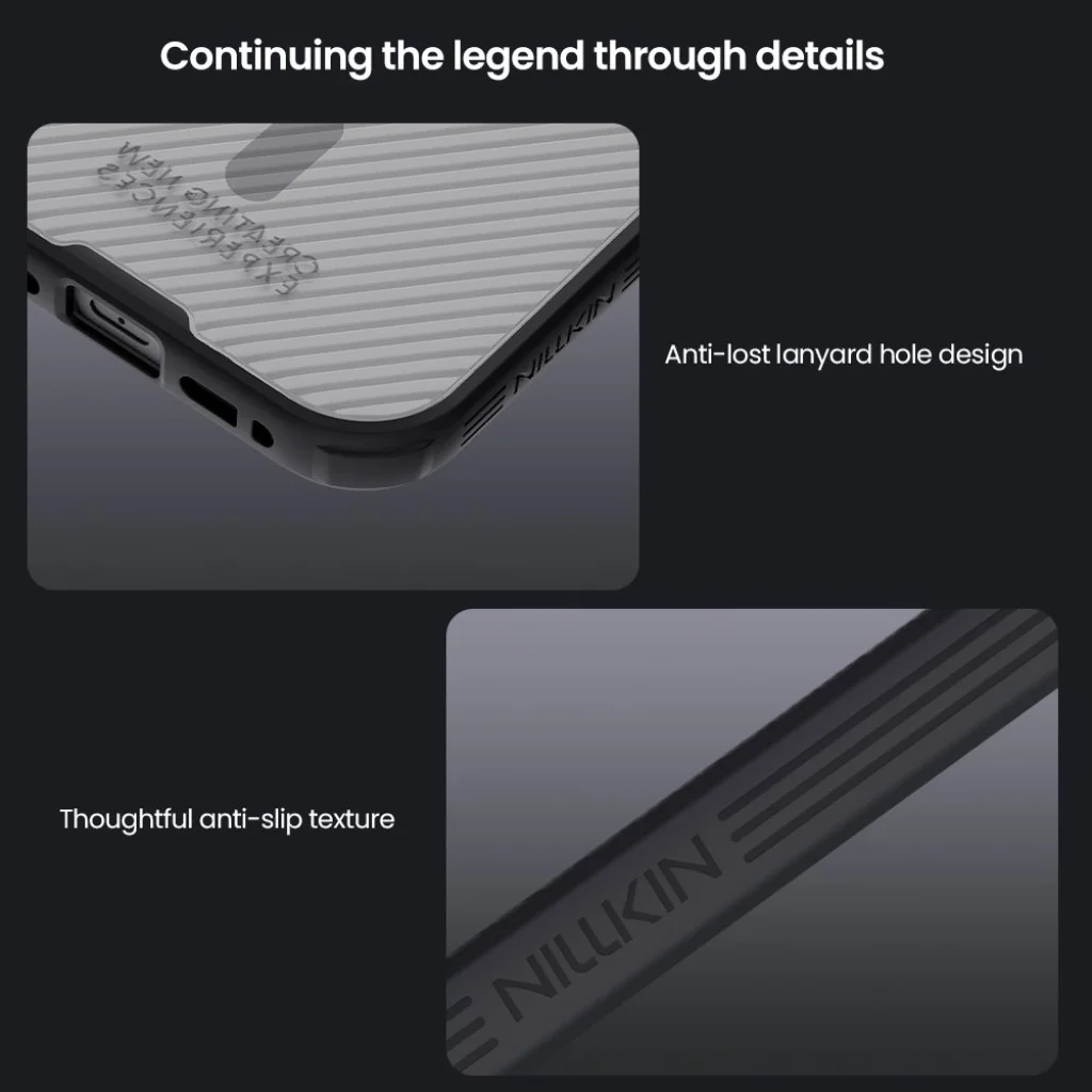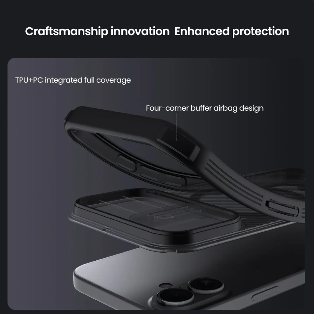 A Nillkin CamShield PRO a védelem új generációját képviseli, amely a klasszikus CamShield funkcionalitását továbbfejlesztve, két anyagból készült kivitelt kínál a maximális biztonság érdekében. A tok hátsó része erős és tartós PC (polikarbonát) műanyagból készült, beleértve a kamera lencsevédőjét is, amely kiválóan ellenáll a karcolásoknak és ütéseknek. A keret lágyított TPU (termoplasztikus poliuretán) anyagból áll, amely rugalmasságának köszönhetően tökéletesen elnyeli az ütéseket, így a telefon szélei és sarkai a lehető legjobban védve vannak.