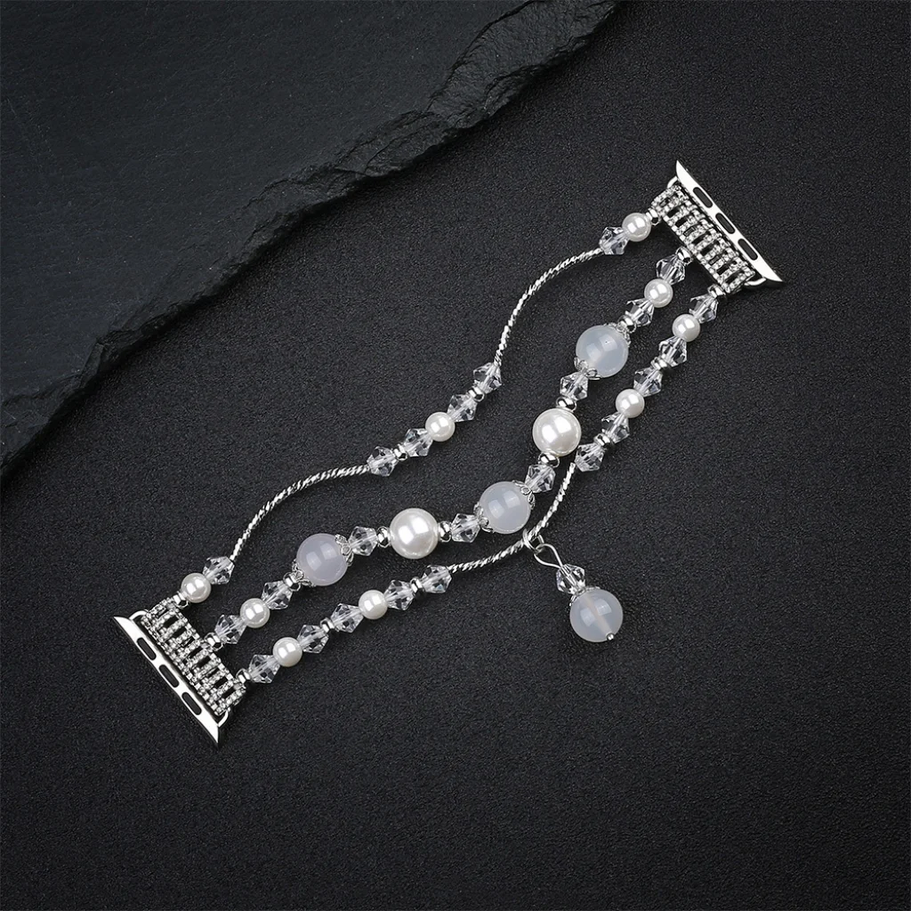 Okosóra szíj divatos kivitelben, csillogó kristályokkal és gyöngyökkel díszítve. Bőrbarát rozsdamentes acélból készült, kényelem használat közben. Az állítható pánt segít a csuklójához igazítani a hosszát. Gyors és egyszerű szíjcsere.