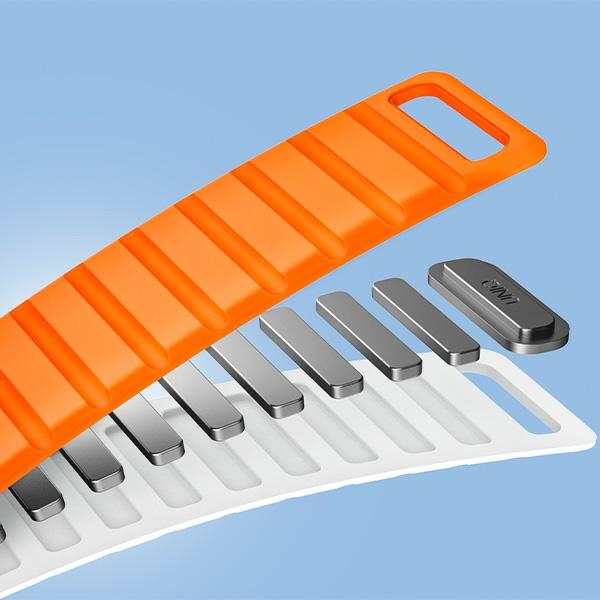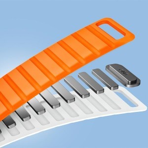 Akár 28 erős, kétirányú neodímium mágnes biztosítja a csuklódhoz megfelelő és állítható illeszkedést, lehetővé téve, hogy gyorsan és egyszerűen fel- és levehesd az órát. A mágneses rögzítés húzóerejét akár 1,2 kg-ra is tesztelték.