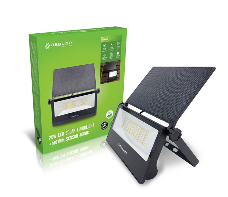 Az Asalite LED Szolár Reflektor 20W 4000K a 20W teljesítmény mellett 1800 lumen fényerősség elérésére képes. A teret 120°-ban képes bevilágítani, így optimális választás lakókörnyezetünk (udvarok, teraszok, autó beállók stb.) külterületeinek megvilágítására.