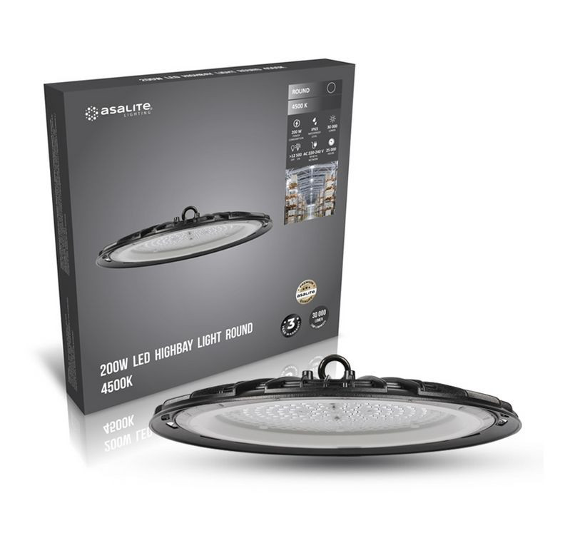 Az Asalite LED Csarnokvilágító 200W 4500K a 200W teljesítmény mellett 30000 lumen fényerősség elérésére képes. A teret 90°-ban képes bevilágítani, így optimális választás raktárak, logisztikai központok, ipari létesítmények, autószalonok, nagy belmagasságú terek, üzletközpontok megvilágítására.