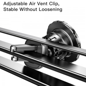 - Stabil és állítható légbeömlő csipesz: A mellékelt, intelligensen tervezett légbeömlő csipesz egyszerűen és biztonságosan rögzíthető az autó szellőzőrácsaira. Az állítható mechanizmusnak köszönhetően stabilan tartja a telefont, anélkül, hogy meglazulna vagy elcsúszna vezetés közben.