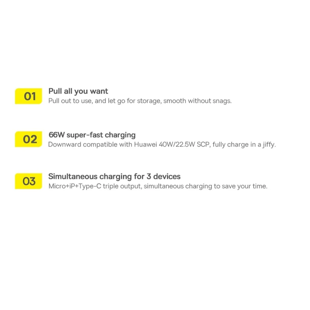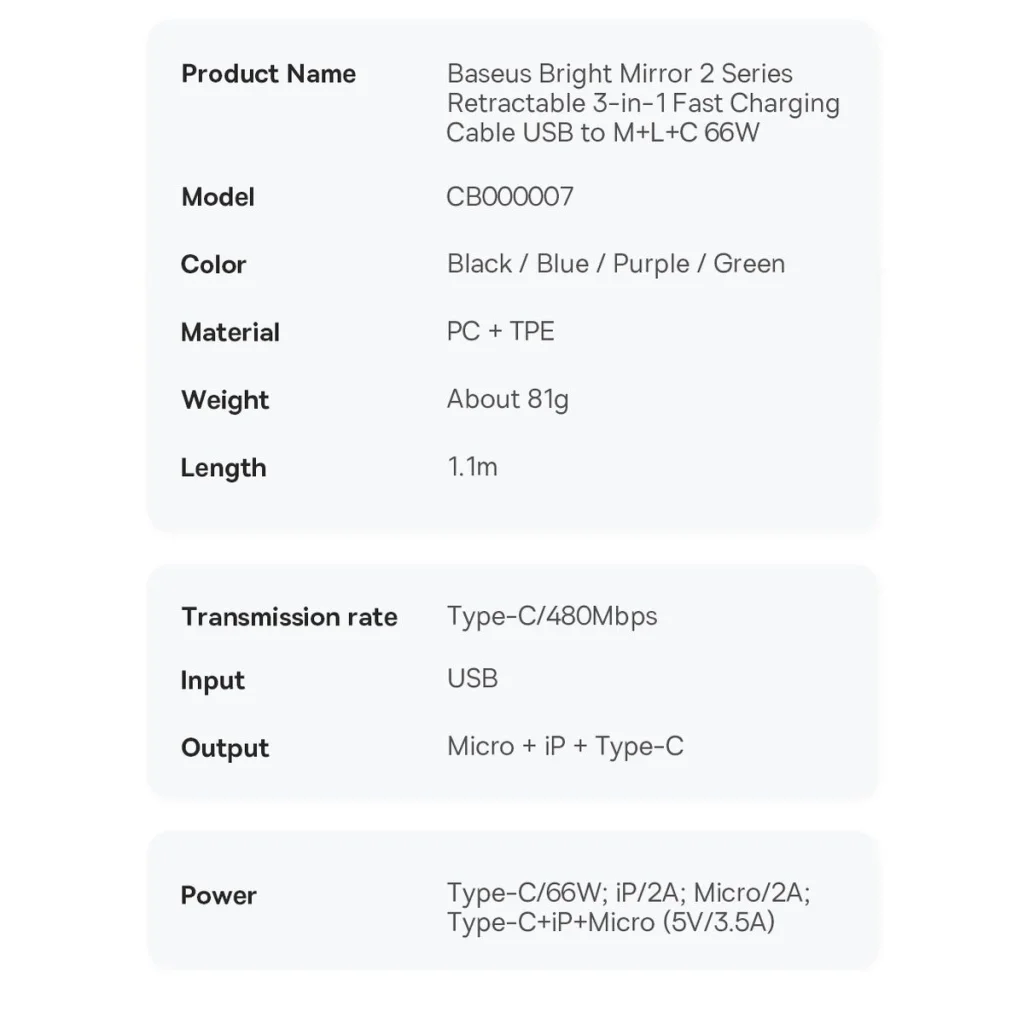 Ha több készüléked van és keresed az optimális megoldást, hogy egyszerre tölthesd mindet, a Baseus kábel nagyszerű megoldás számodra. Az univerzális kábel három csatlakozóval rendelkezik - USB Type C, Lightning Apple készülékekhez és micro USB. Műszaki adatok: