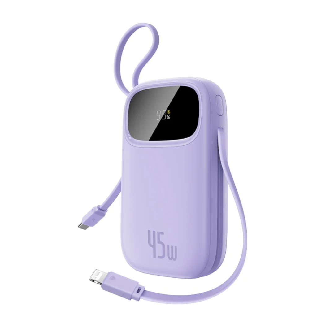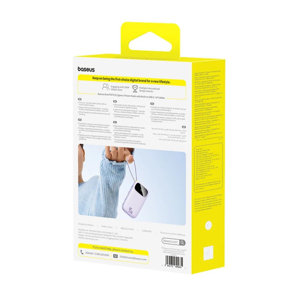 A Baseus EnerFill FC31 egy erőteljes 20,000mAh kapacitású power bank, amely akár 45W-os gyorstöltést is kínál, beépített USB-C és Lightning kábelekkel felszerelve. Ezek lehetővé teszik, hogy kényelmesen töltsd eszközeidet további kábelek nélkül, miközben a digitális kijelző lehetővé teszi, hogy bármikor ellenőrizd az energia szintet. Négy kimenet növeli a funkcionalitást, lehetővé téve több eszköz egyidejű töltését. A lila változat modern dizájnjával és stílusos karakterével tűnik ki.