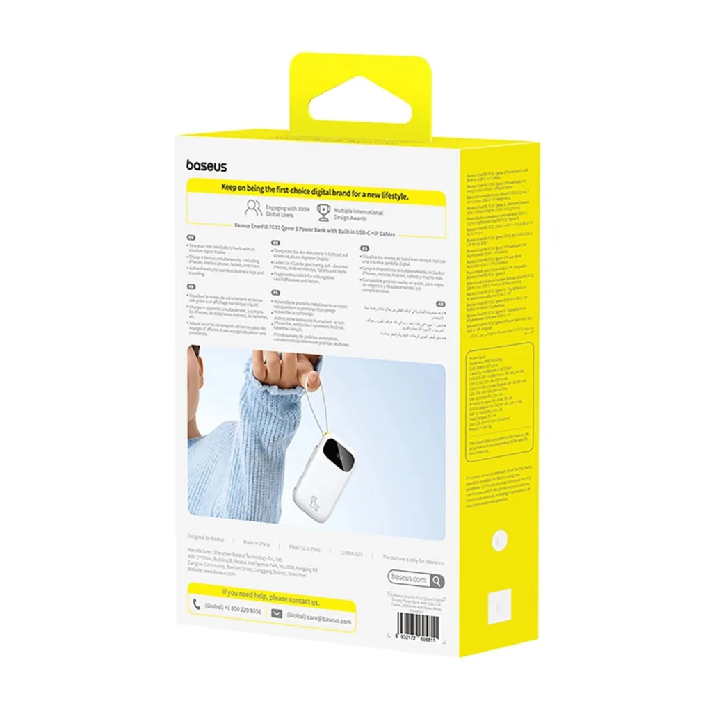 A Baseus Qpow 3 45W power bank egy kompakt és modern power bank, amely 20000 mAh kapacitással rendelkezik, a maximális felhasználói kényelem érdekében tervezve. A beépített Lightning és USB-C kábelek megszüntetik a plusz kábelek cipelésének szükségességét, és lehetővé teszik az eszközök gyors csatlakoztatását. A 45W-os kimeneti teljesítmény gyors és hatékony töltést biztosít okostelefonok, táblagépek, fejhallgatók, órák és egyéb mobil eszközök számára. A tiszta LED kijelző folyamatosan tájékoztat a power bank töltöttségi szintjéről, míg a 9 rétegű biztonsági rendszer védi a túlmelegedés, túltöltés és rövidzárlat ellen, biztosítva a biztonságos használatot bármilyen helyzetben.