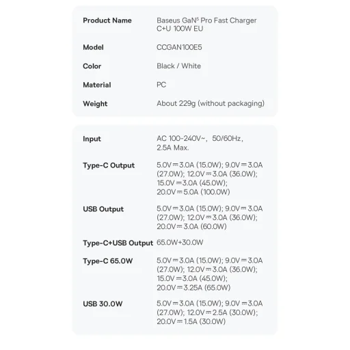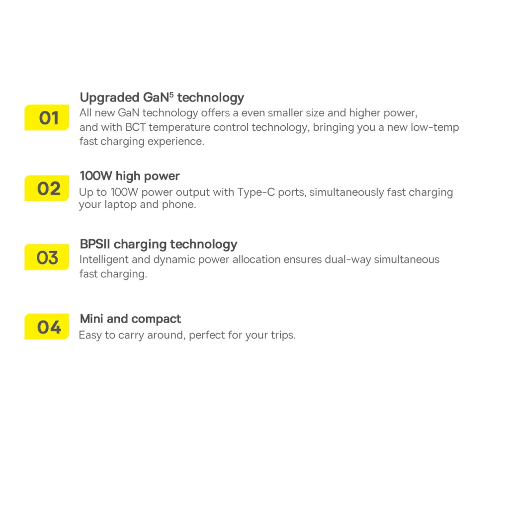 Tökéletes USB Type C (100W) csatlakozóval rendelkező laptopok töltésére. Két készülék egyidejű töltésére van lehetőség. A felhasználónak nem kell aggódnia rövidzárlatok vagy túlfeszültségek miatt. A BPS (Baseus power split) technológia lehetővé teszi a kimeneti áram intelligens megosztását több eszköz működtetése esetén. A Baseus GaN töltő használatának kényelmének javítása érdekében a gyártó 6 védelmet alkalmazott, beleértve a túlmelegedést, a túlfeszültséget, a magas feszültséget, a túlterhelést, a túlzott energiafogyasztást és az elektrosztatikát.