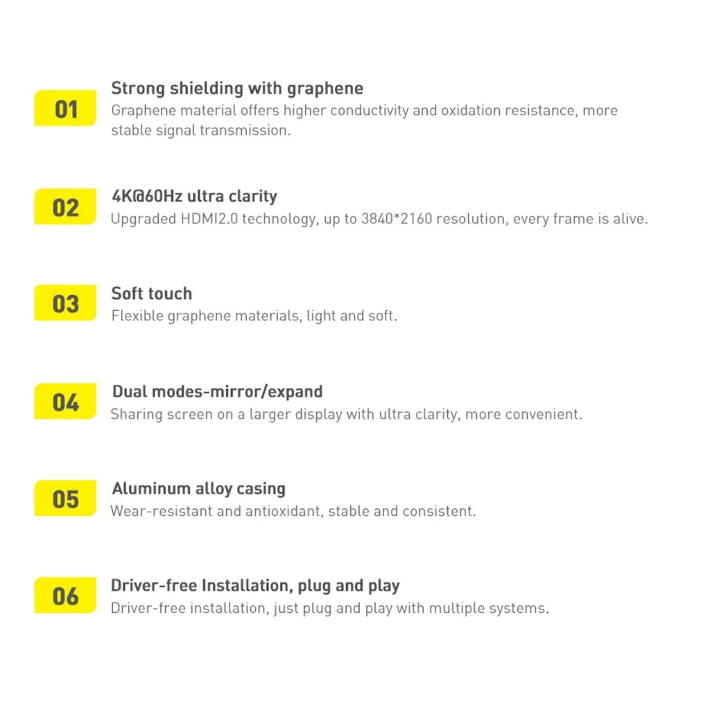 Ahhoz , hogy a legjobb kép- és hangminőséget élvezhesse TV-jén, érdemes jó minőségű HDMI-kábelt vásárolni. A Baseus által gyártott kábel garantálja, hogy a TV-jén nézett filmek élénk és élénk színűek lesznek, a hang pedig tiszta és zajmentes lesz. Ez még nagyobb távolságokon is jobb adatátvitelt garantál. A hang és a kép tömörítés nélkül, a legmagasabb minőség megőrzése mellett történik. Tökéletes TV, DVD lejátszó, Blue-Ray lejátszó, laptop, projektor csatlakoztatásához.