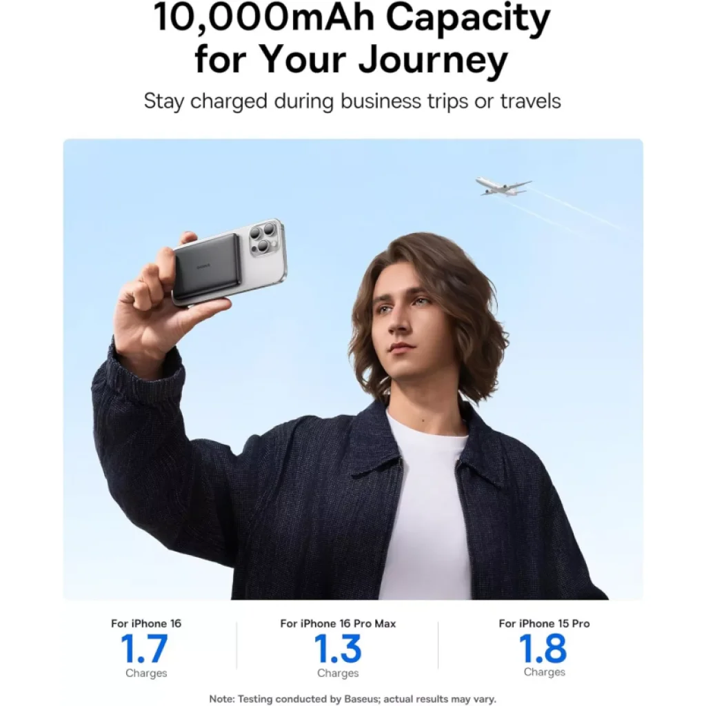 - Hosszú élettartam: Egyetlen töltéssel akár 1.7 alkalommal töltheted fel az iPhone 16-ot, 1.3 alkalommal az iPhone 16 Pro Max-et, vagy 1.8 alkalommal az iPhone 15 Pro-t.