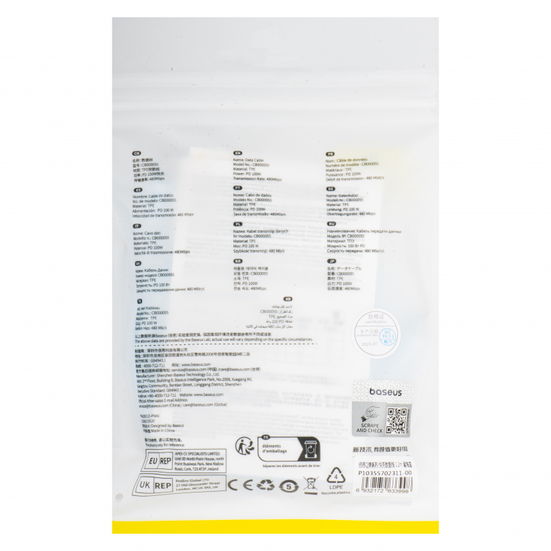 A Baseus Pudding Type-C to USB Type-C kábel használható töltésre áramadapterrel vagy laptophoz csatlakozatva töltésre vagy adat szinkronizációra. Maximum 100W teljesítményt támogat, adatátviteli sebessége 480 Mbps, és kompatibilis a Type-C porttal rendelkező eszközökkel. Rugalmasszilikonból készült, ami hosszú távú tartósságot biztosít. Ezen felül egy intelligens chipet is tartalmaz, amely védi az eszköz akkumulátorát.