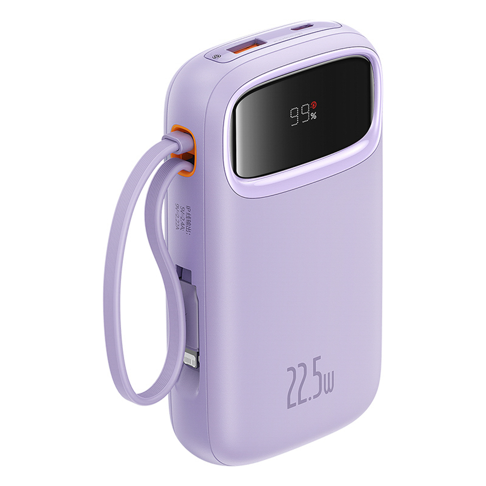 A Baseus Qpow2 Powerbank 20,000mAh kapacitással és 22.5W kimeneti teljesítménnyel egy funkcionális és stílusos energiaforrás az eszközeid számára. Az integrált USB-C és Lightning kábelek révén nem szükséges extra kábeleket hordoznod – minden, amire szükséged lehet, mindig kéznél van. A visszahúzható kábel mechanizmus és a kompakt, könnyű kialakítás ideálissá teszi az eszközt utazásokhoz és mindennapos használatra. A digitális LED kijelző mutatja a pontos töltöttségi szintet, a védelem pedig garantálja az eszközeid biztonságos töltését. A csomag tartalmaz egy Baseus Simple USB-C 3A kábelt, 0.3 m hosszúságban. A lila kivitel modern és elegáns karaktert kölcsönöz a powerbanknek.