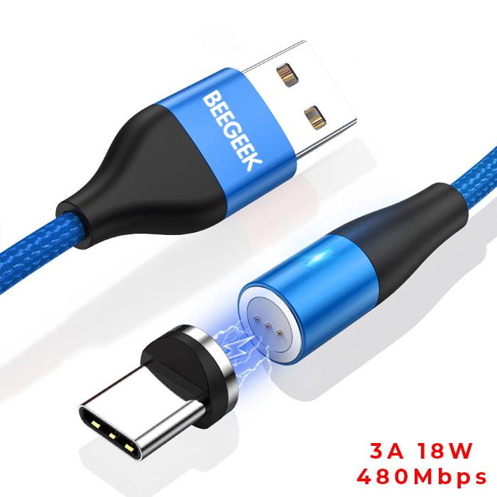 BeeGeek AM60 USB kábel 1M 3A 18W QC 3.0 gyorstöltés USB-C mágneses fejjel, 1 méter kék színben