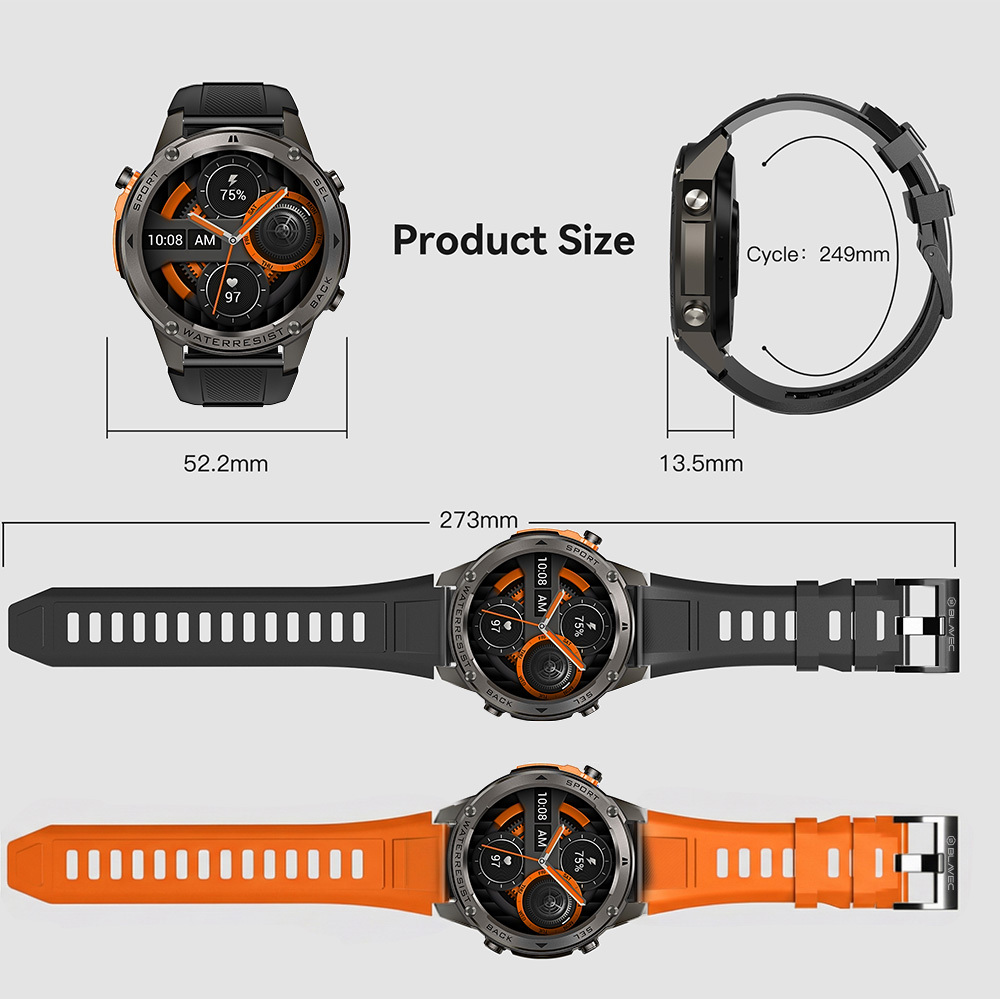 A Blavec Smartwatch M-03 Predator egy kivételesen robusztus és intelligens okosóra, amely a legextrémebb körülmények között is megállja a helyét. A prémium 1.43 hüvelykes AMOLED kijelző, a beépített GPS és a Bluetooth hívás funkció révén ez az okosóra nem csupán egy időmérő, hanem egy megbízható társ a mindennapokban és a legkeményebb edzések során is. A grafit színű tokozással és a kiegészítő szíjjal (a képek alapján egy fekete és egy narancssárga szíj is tartozék) stílusban és funkcionalitásban is kiemelkedő választás.