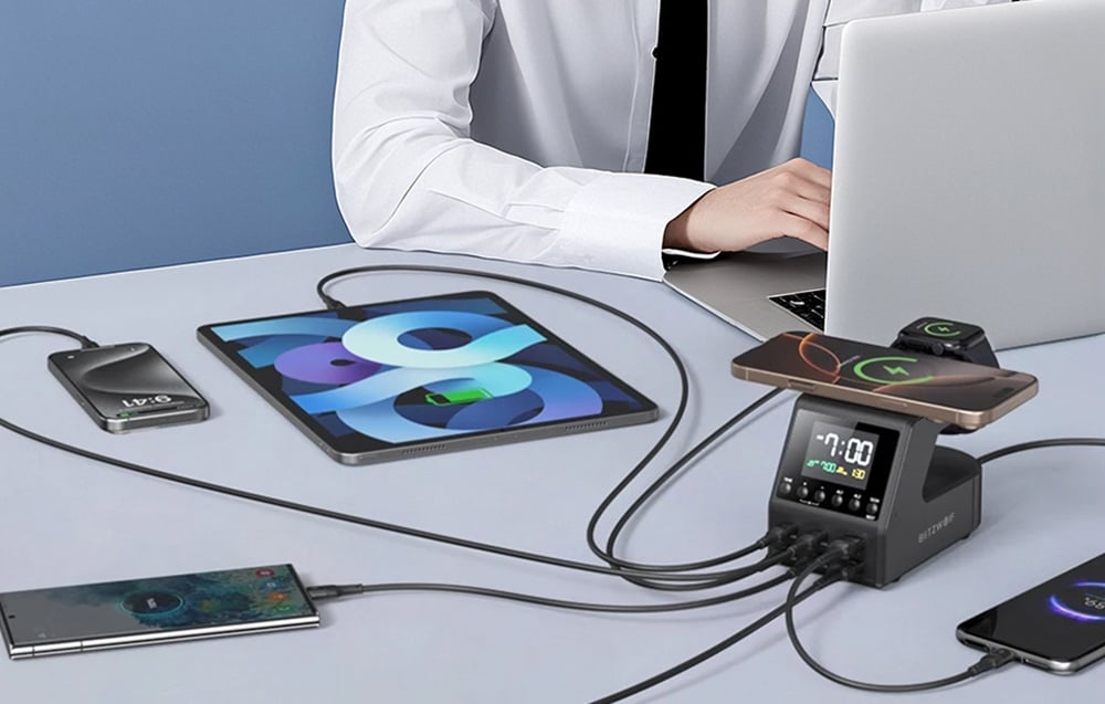 A BW-FW10 akár 8 eszköz egyidejű töltését is lehetővé teszi - a 4 USB-C portnak, 2 USB-A portnak és két vezeték nélküli töltési zónának (15 W egy telefonhoz és 5 W egy okosórához) köszönhetően. Az egész támogatja a PD 3.1 gyorstöltést (akár 140 W), a PPS-t és a QC 4.0-t, ami teljes kompatibilitást jelent laptopokkal, táblagépekkel, konzolokkal és telefonokkal, beleértve a MacBook Pro 16-ot is.