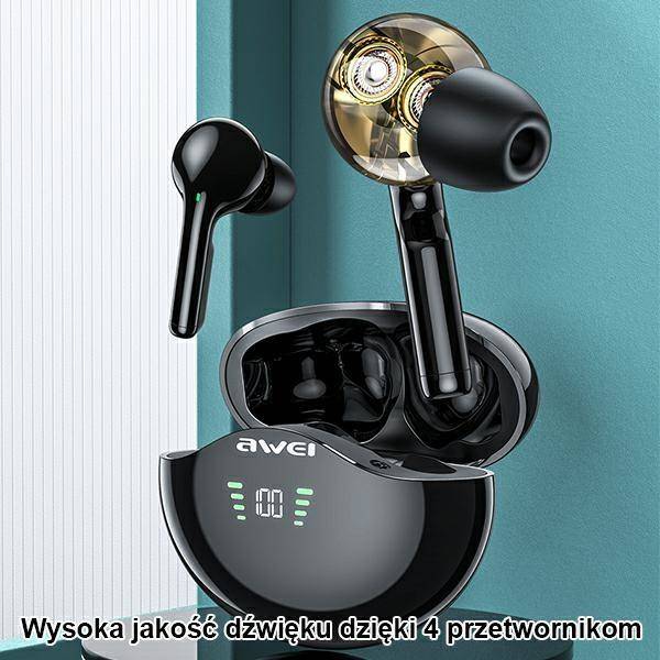 Az AWEI T12P ergonomikus, vezeték nélküli fülhallgató töltőállomással. Kompakt kialakítás, tele fejlett technológiával, az aktív zajszűréstől és hangminőségtől kezdve az intelligens hangvezérlésig.