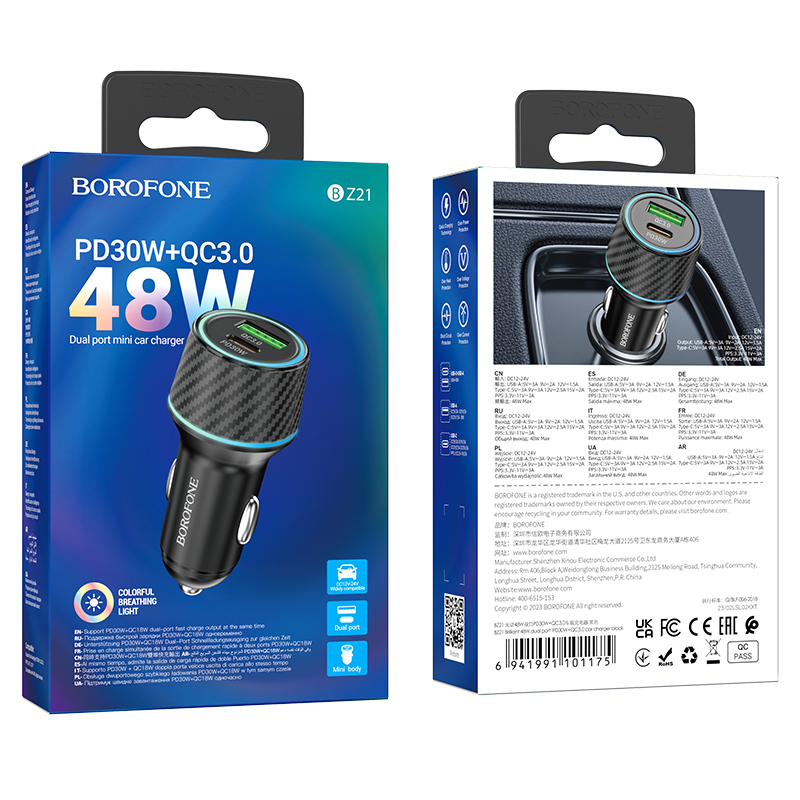 Borofone autós töltő BZ21 Brilliant - USB + Type C - QC 3.0 PD 48W fekete