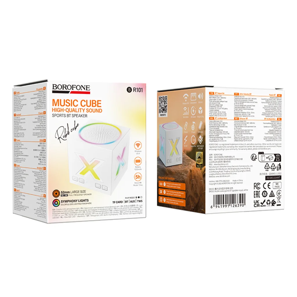 A Borofone Vezeték Nélküli Bluetooth Hangszóró BR101 Rubik – fehér készülék egy kompakt és stílusos hangszóró, amely tiszta hangzást és stabil Bluetooth kapcsolatot biztosít, ideális mindennapi használatra otthon, az irodában vagy útközben. A Bluetooth 5.4 technológiával és a hatékony JL AC6965E4 chipkészlettel felszerelve a hangszóró gyors párosítást és megbízható csatlakozást garantál. Az 1200 mAh-s akkumulátor akár 5 órányi zenelejátszást is lehetővé tesz, a teljes feltöltés pedig körülbelül 3 órát vesz igénybe. A TWS támogatás lehetővé teszi két hangszóró párosítását a valódi sztereó élmény érdekében.