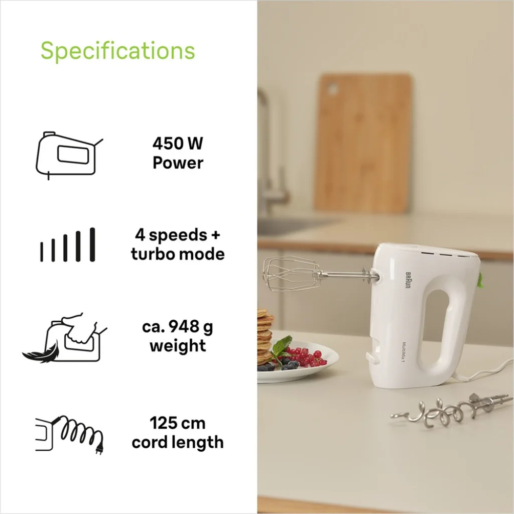 A Braun MultiMix1 HM1110WH kézi mixerrel a sütés és főzés sosem volt még ilyen egyszerű és élvezetes! Ez a kompakt, mégis erőteljes konyhai segítő 450 W-os motorjával és sokoldalú funkcióival pillanatok alatt megbirkózik a legkülönfélébb tésztákkal és krémekkel, hogy Ön gyorsan és könnyedén varázsolhasson finomságokat az asztalra.