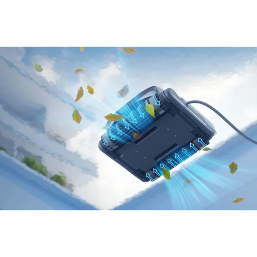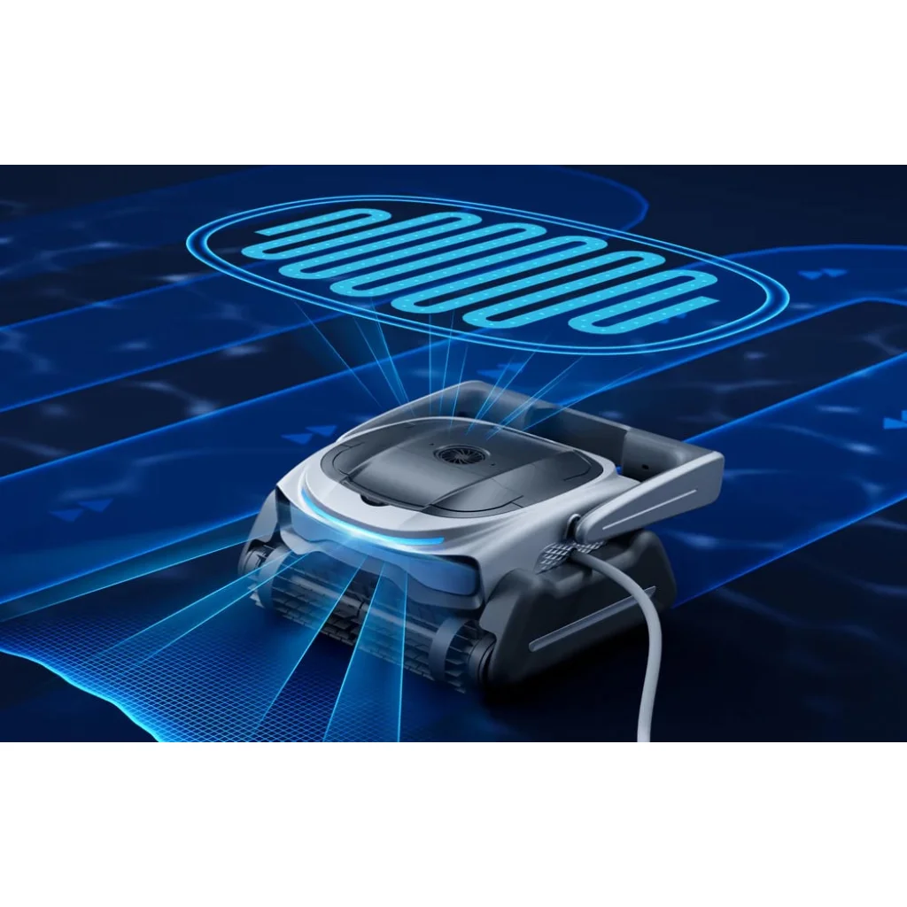 A kettős szívórendszer kétirányú hulladékgyűjtést tesz lehetővé – mind a robot elülső, mind hátsó részéről –, ami csökkenti a teljesítményvesztést irányváltáskor. Két független szűrőkosár, mindegyik 3 literes kapacitással, nagy összterületet biztosít a begyűjtött hulladékok számára, így hosszabb ideig működhet anélkül, hogy ki kellene üríteni. A 180 µm-es szűrők hatékonyan fogják meg a finom részecskéket, például a homokot és az üledéket, miközben a nagyobb hulladékokat is visszatartják, így egyetlen ciklus alatt pontosan megtisztítják az egész medencét.