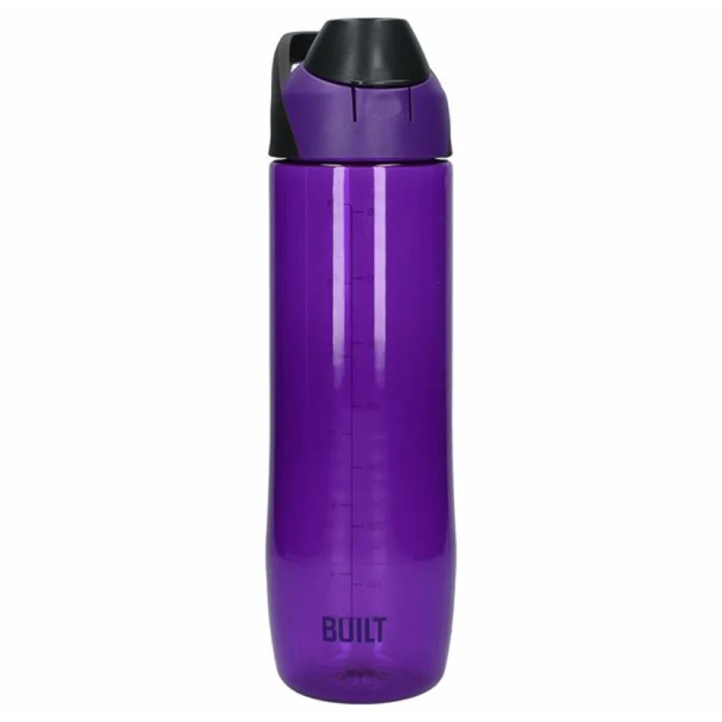 Ez az italpalack átlátszó, lila-fekete fedéllel, amely egyszerű klipsz funkcióval rendelkezik a könnyebb használat és a hordozhatóság érdekében. A fogantyúnak van egy nyílása, ami azt jelenti, hogy rögzítheti táskához vagy kabáthoz.