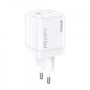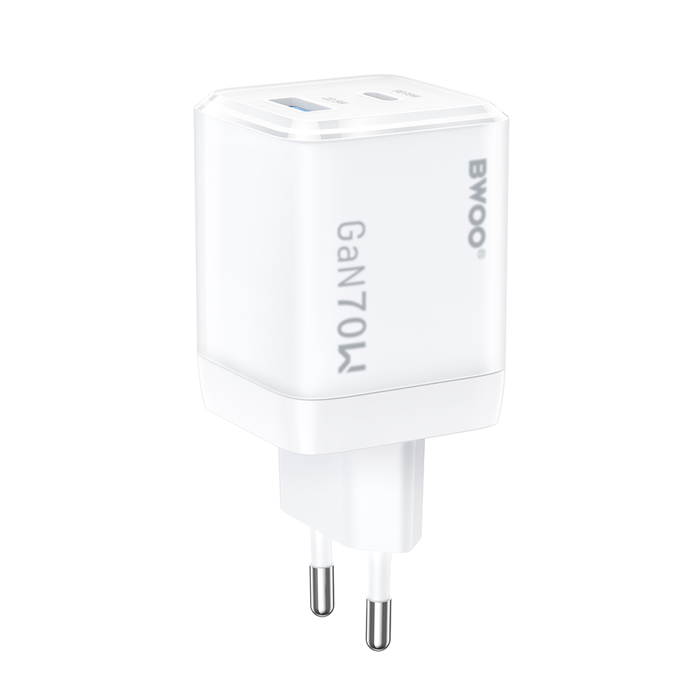 A modern, átlátszó BWOO töltő GaN technológiával összesen 70W kimenő teljesítményt biztosít, lehetővé téve 2 eszköz egyidejű gyors töltését maximális sebességgel. Ideális munka, utazás és napi használatra.
