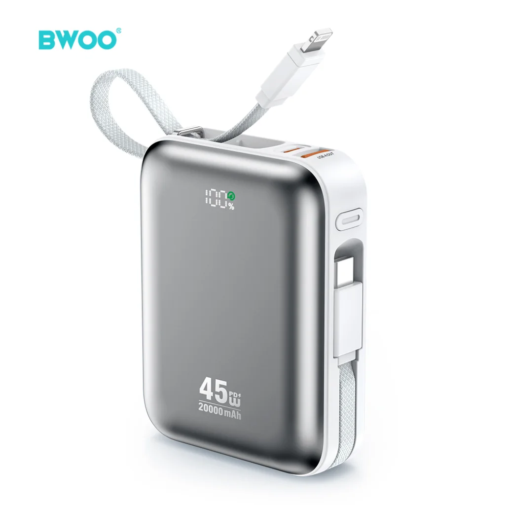 A BWOO 20000mAh PD45W beépített kábelekkel rendelkező power bank egy fejlett energiaforrás, amely 45W teljesítménnyel gyors és hatékony töltést kínál. A BO-P78 modell gyors, stabil és biztonságos áramellátást garantál okostelefonok, táblagépek és akár kompatibilis laptopok számára is. Az eszköz maximális kényelmet nyújt, és két beépített kábel található rajta, lehetővé téve több eszköz egyidejű töltését anélkül, hogy további kábeleket kellene magunkkal vinni. Csak csatlakoztassa az eszközöket, és élvezze a zökkenőmentes, gyors töltést bármilyen helyzetben. A precíz LED akkumulátor szintjelző teljes ellenőrzést biztosít a fennmaradó energia felett. Az intuitív kijelző lehetővé teszi a power bank újratöltésének egyszerű tervezését, így nem szükséges találgatni. A 20000mAh nagy kapacitás jelentősen meghosszabbítja az eszközök üzemidejét, miközben kompakt és kényelmesen szállítható kialakítást biztosít. A power bank teljes mértékben megfelel a nemzetközi légi szabályozásoknak, így tökéletes utazáshoz, szabadtéri tevékenységekhez vagy mindennapi használatra.