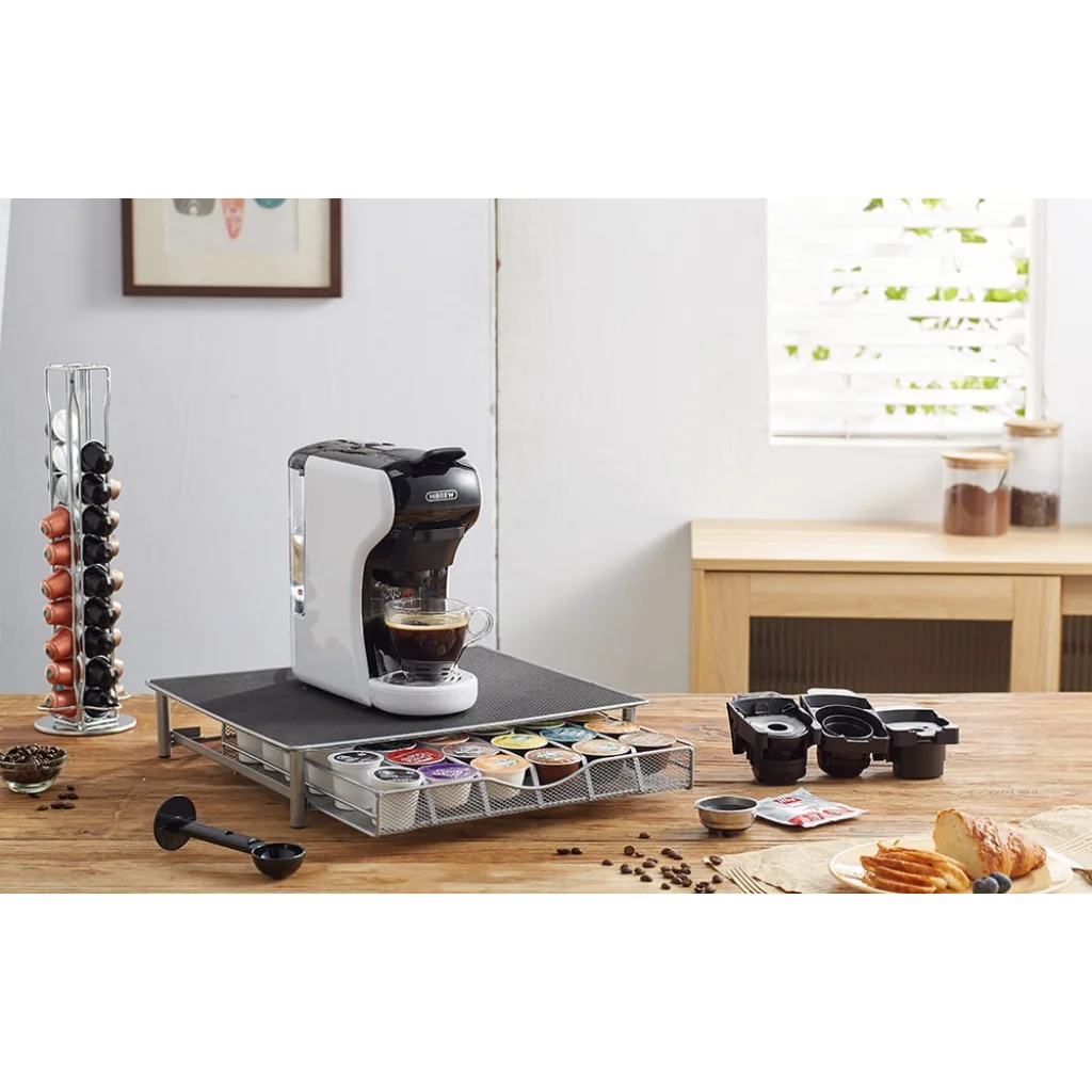 HiBREW H1A-fehér (fehér) 4-az-1-ben kapszulás kávéfőző. Most könnyedén elkészítheti a finom, aromás kávét. A HiBREW H1A kávéfőző 19 bar nyomással rendelkezik, és a használt technológiának köszönhetően gyorsan felmelegszik és stabilan tartja a hőmérsékletet a megfelelő szinten. Rendkívül csendesen működik, és a használata rendkívül egyszerű. Az eszköz kompatibilis a Nespresso és Dolce Gusto kapszulákkal, valamint ESE tasakokkal, emellett lehetővé teszi őrölt kávé főzését is. Egy élénkítő espresso? Vagy esetleg egy aromás americano? A választás az öné!