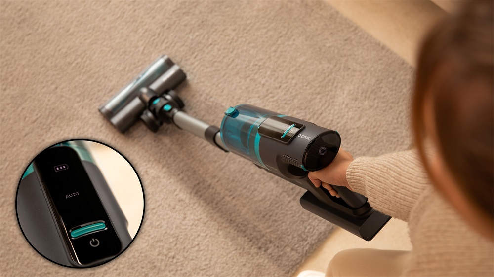 - Az automatikus üzemmód intelligensen alkalmazkodik: érzékelői segítségével a porszívó felismeri a szennyeződés mértékét és a felület típusát, automatikusan beállítva a szívóerőt. Ez nemcsak a tisztítás hatékonyságát növeli, de jelentősen meghosszabbítja az akkumulátor üzemidejét is.