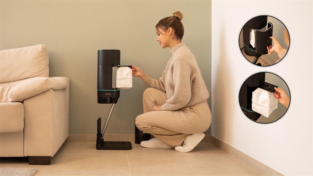- A dokkolóba illesztett **cserélhető porzsákok** biztosítják a pormentes ürítést és a higiénikus tárolást, minimalizálva az allergének levegőbe jutását.