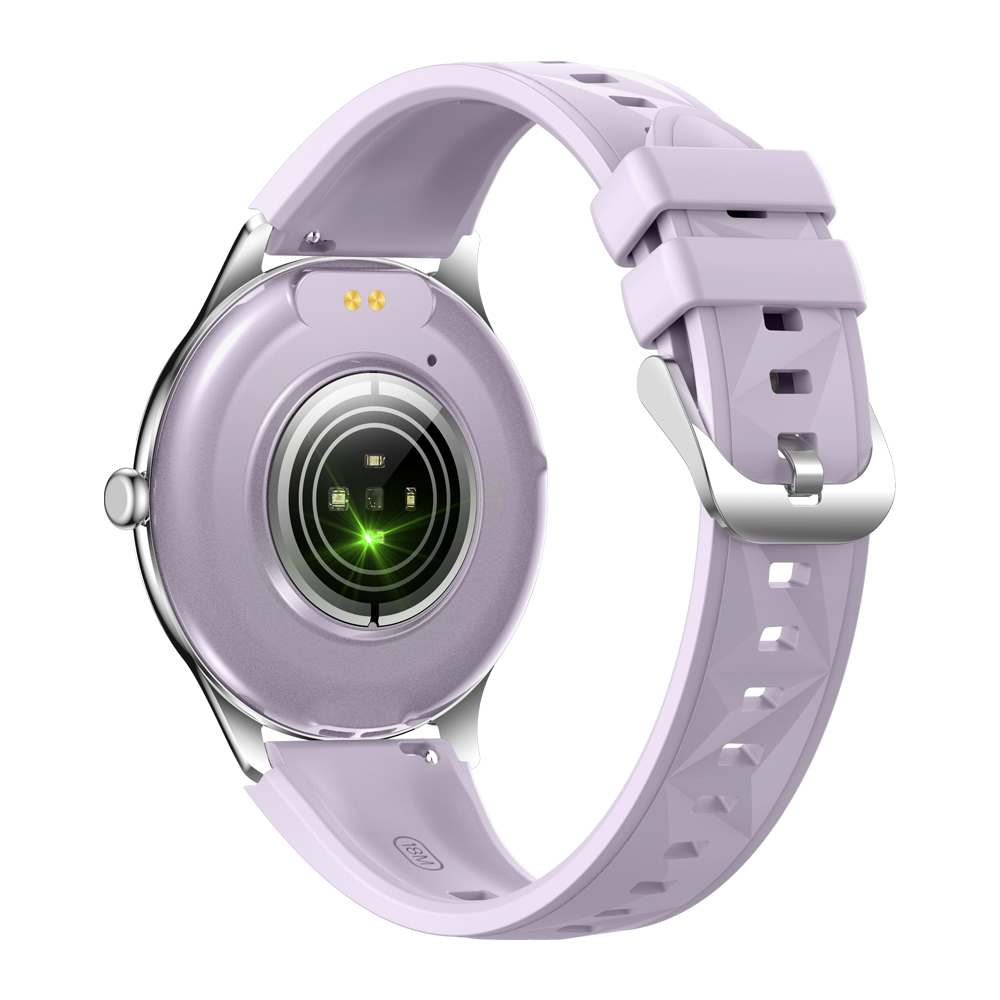 - Prémium anyagok és megjelenés: Az ötvözetből készült tok, a lila szilikon és a bőr szíj kombinációja elegáns és kényelmes viseletet biztosít. A 7.9 mm-es ultra-vékony test és a 3D gömb alakú képernyő igazi vizuális élményt nyújt.