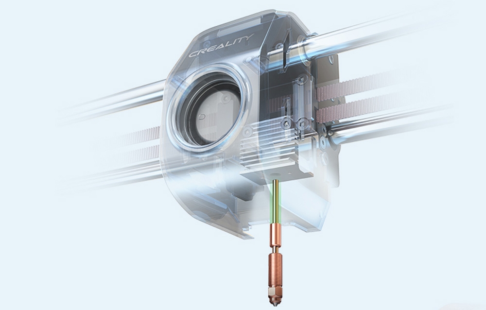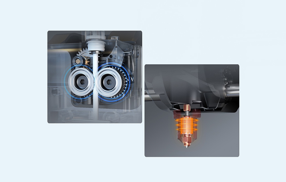 Kettős extruder - kevesebb elakadás, jobb anyagáramlás. A K1-SE-ben használt kettős extruder meghajtórendszer biztosítja a szál stabil adagolását, ami kevesebb elakadást és az anyagáramlás jobb kontrollálhatóságát eredményezi. A kerámia fűtőelem nagyon gyorsan felmelegszik, ami csökkenti az előnyomási időt. Emellett a titáncső és a nagy szilárdságú acélfúvóka hosszú élettartamot biztosít.