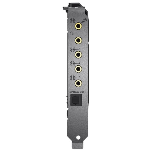 - Fő bemeneti lehetőségek: 1 optikai TOSLINK kimenet, 1 x 3.5 mm Hátsó kimenet, 1 x 3.5 mm Center/Sub kimenet, 1 x 3.5 mm Mikrofon/Vonali bemenet (alapértelmezett Mic-ként, szoftverrel váltható opciók), 1 x 3.5 mm Fejhallgató/Fülhallgató kimenet (alapértelmezett Fejhallgatóként), 1 x 3.5 mm Első kimenet