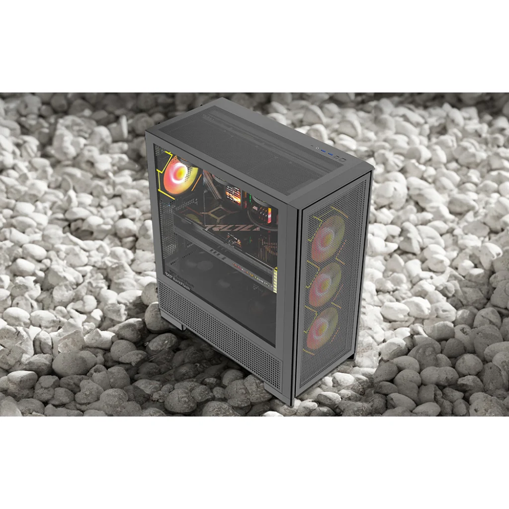 A DarkFlash AIRNOVA egy tágas Big Tower ház, amely támogatja az E-ATX, ATX, M-ATX és ITX alaplapokat, és helyet biztosít akár 395 mm hosszú grafikus kártyáknak és 175 mm magas CPU hűtőknek. A ház figyelemre méltó szellőzésről gondoskodik a 5x5 mm-es nagy szembőségű szellőzőpanelekkel, 3 db 120 mm-es ventilátorral és 420 mm-es vízhűtés támogatásával. A felső panelen találhatók a szükséges csatlakozók, mint például két USB 3.0 port, HD Audio bemenet, bekapcsoló és reset gombok, valamint egy gyors USB Type-C Gen2 (10 Gbps) csatlakozó, amely jelentősen javítja az adatátvitelt.