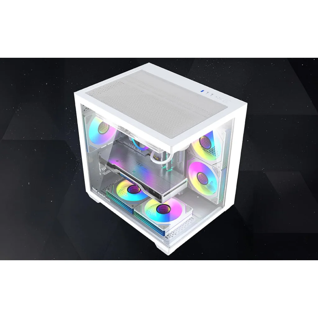 A DarkFlash B275 egy kompakt számítógép-ház, amelyet M-ATX vagy ITX alaplapokon alapuló modern rendszerekhez terveztek. A két átlátszó panellel és függőleges sarokprofil nélkül kialakított kialakítás 270°-os panorámaképet biztosít, és lehetővé teszi a belső tér teljes láthatóságát. Ez a modell legfeljebb 340 mm hosszú grafikus kártyákat és legfeljebb 160 mm magas CPU-hűtőket támogat. Így kompakt formában is létrehozhat egy nagy teljesítményű konfigurációt!