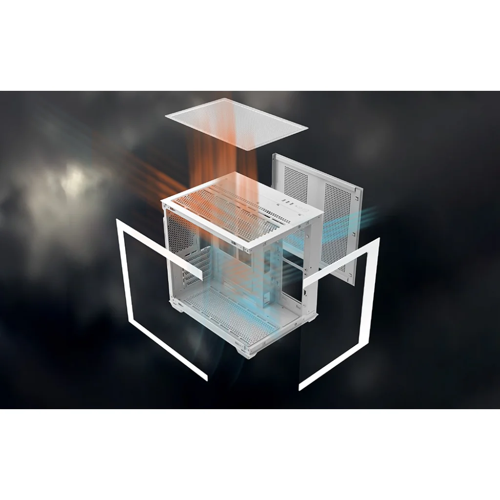 A DarkFlash B275 gyorskioldó kialakítással rendelkezik, amely lehetővé teszi a panelek gyors eltávolítását. Ez kényelmes hozzáférést biztosít a ház belsejéhez, lehetővé téve a készlet hatékony karbantartását vagy bővítését. Ezenkívül a jól átgondolt kialakítás segít a helyiség rendezésében és az alkatrészek rendezett elrendezésében. A kialakítás por szűrőket is tartalmaz (a tetején és az alján), amelyek segítenek a komponensek tisztán tartásában.