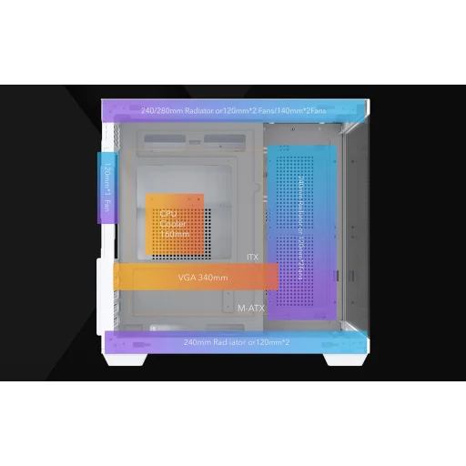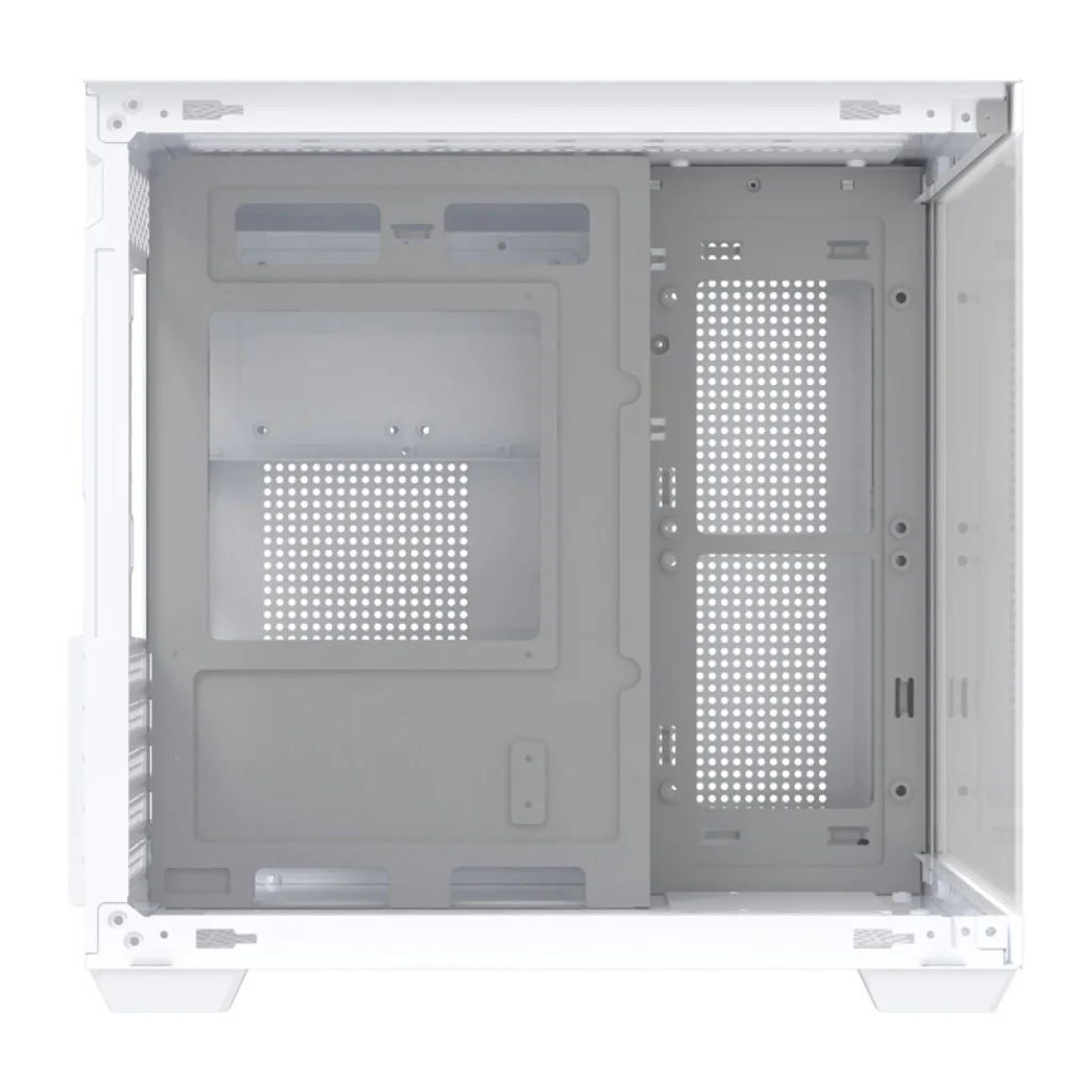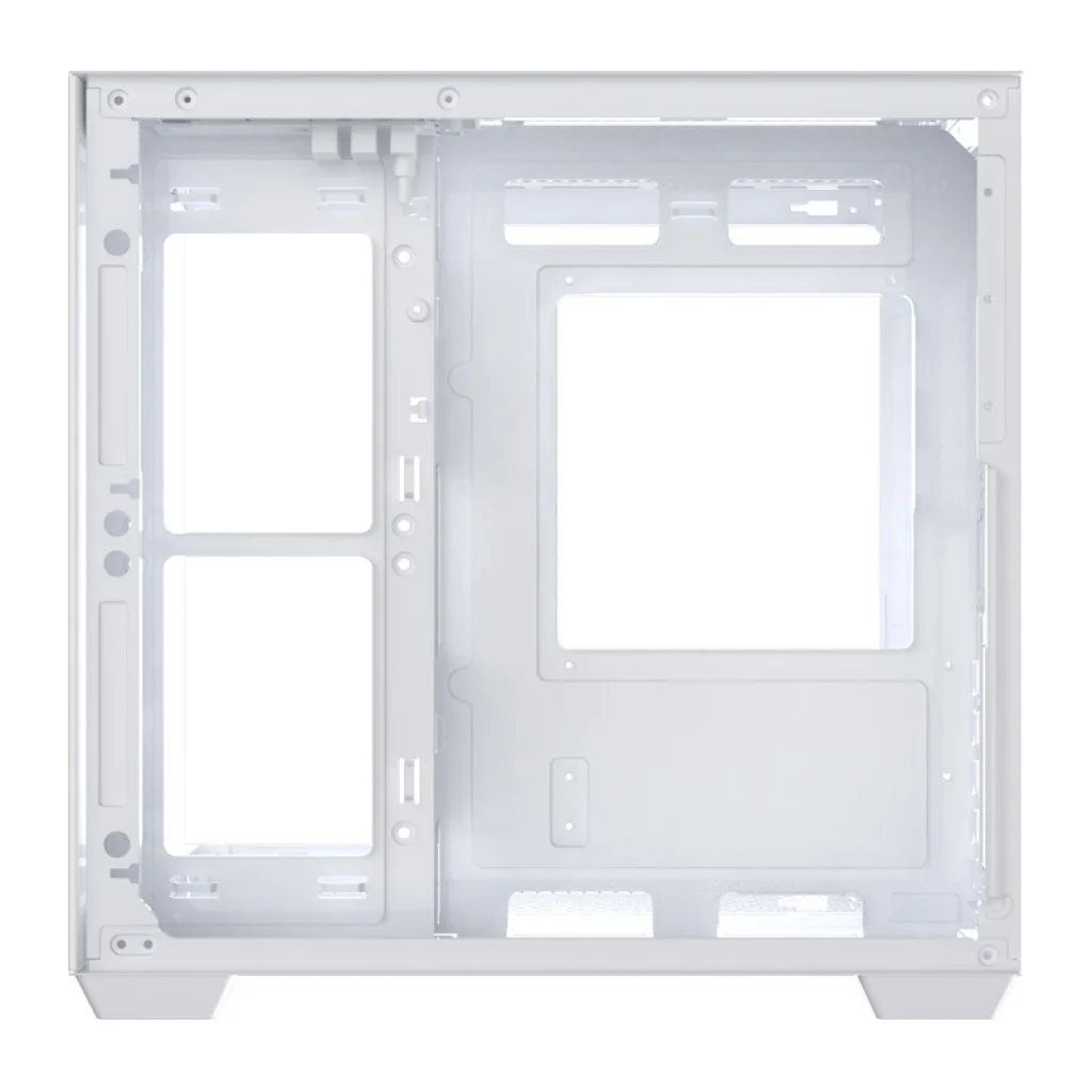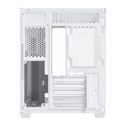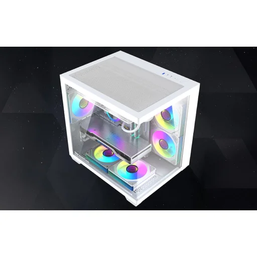 A ház üvegpanelekkel van ellátva, amelyek 270°-os panorámás kilátást biztosítanak a belső térre. Az A-oszlop nélküli kialakításnak köszönhetően minden alkatrész jól látható elölről és oldalról. Ez a megoldás különösen jól működik RGB világítási készletekkel, hangsúlyozva az egész konfiguráció esztétikáját. Valósítsa meg ötleteit, és építsen egy számítógépet, amely kiemelkedik a tömegből!