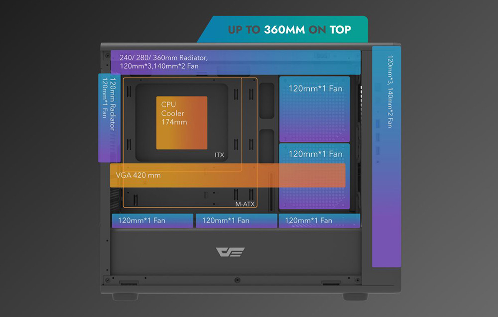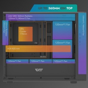 Kivételes hűtési teljesítmény A Darkflash DB460M akár 12 darab 120 mm-es vagy 4 darab 140 mm-es ventilátor telepítését is lehetővé teszi, ami kiváló hőelvezetést jelent a PC belsejéből. A ház támogatja a vízhűtés beépítését is - akár 360 mm hosszú hűtőbordát is felszerelhet, így ideális választás a nagy hőteljesítményt igénylő rendszerekhez.
