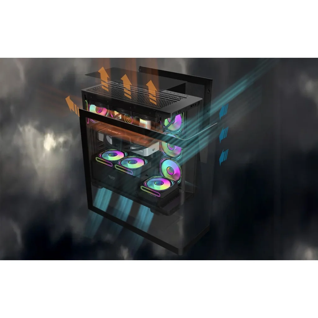 A házat az optimális légkeringés érdekében tervezték. Akár 10 darab 120 mm-es ventilátor telepítését is lehetővé teszi, vagy ezek kombinálását 2 darab 140 mm-es ventilátorral a felső panelen. Lehetőség van 3 ventilátor elhelyezésére a tetején, 3 az oldalán, 1 hátul és 3 az alján, ami hatékony hűtést biztosít. Ezenkívül a felső panelre akár 360 mm-es vízhűtés is építhető, az oldalra pedig akár 240 mm-es.