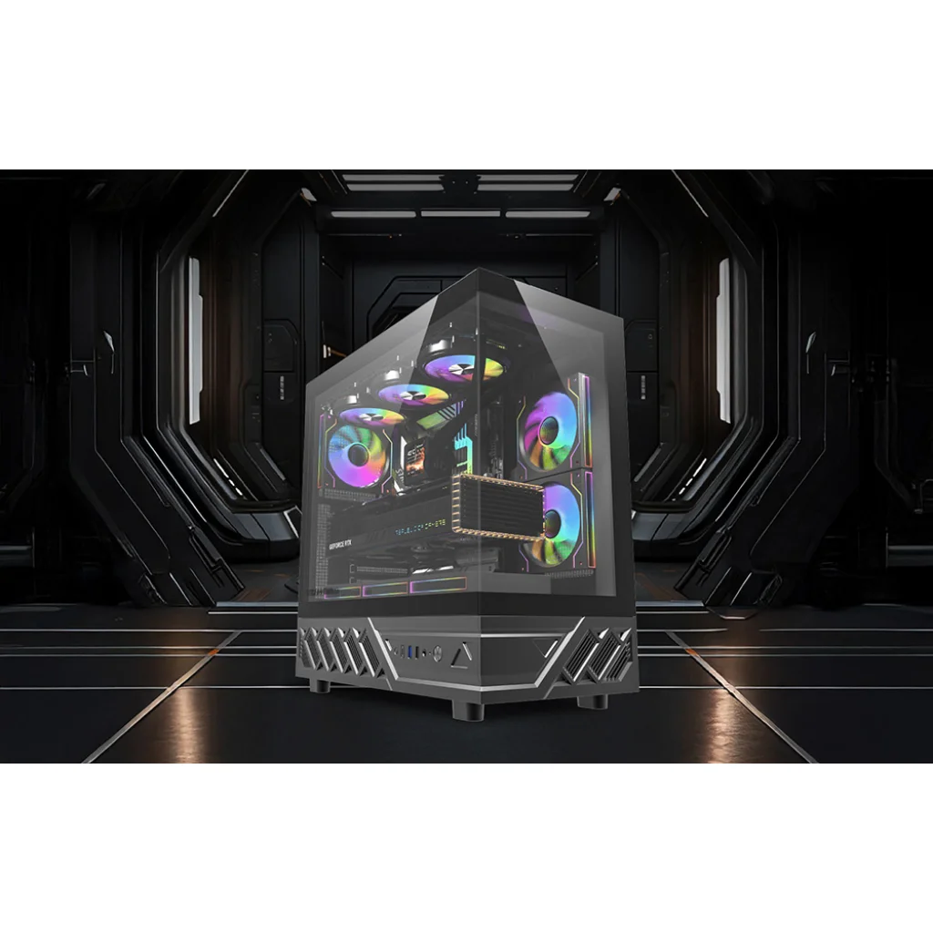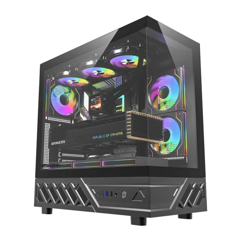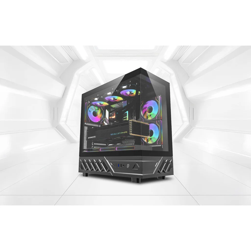 270°-os panorámás kialakítás A ház két átlátszó panellel rendelkezik, amelyeknek nincs függőleges profilja, így széles kilátást biztosítanak az alkatrészekre. Ez a kialakítás érdekes vizuális effektusokat tesz lehetővé – például bemutathatja az RGB ventilátorokat vagy a vízhűtést egy kijelzővel. Adjon egyedi karaktert a számítógépének!