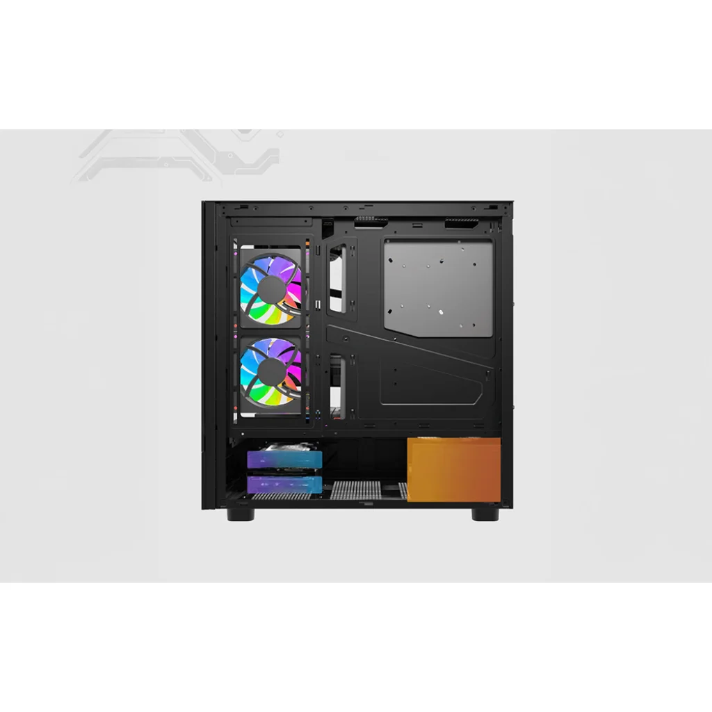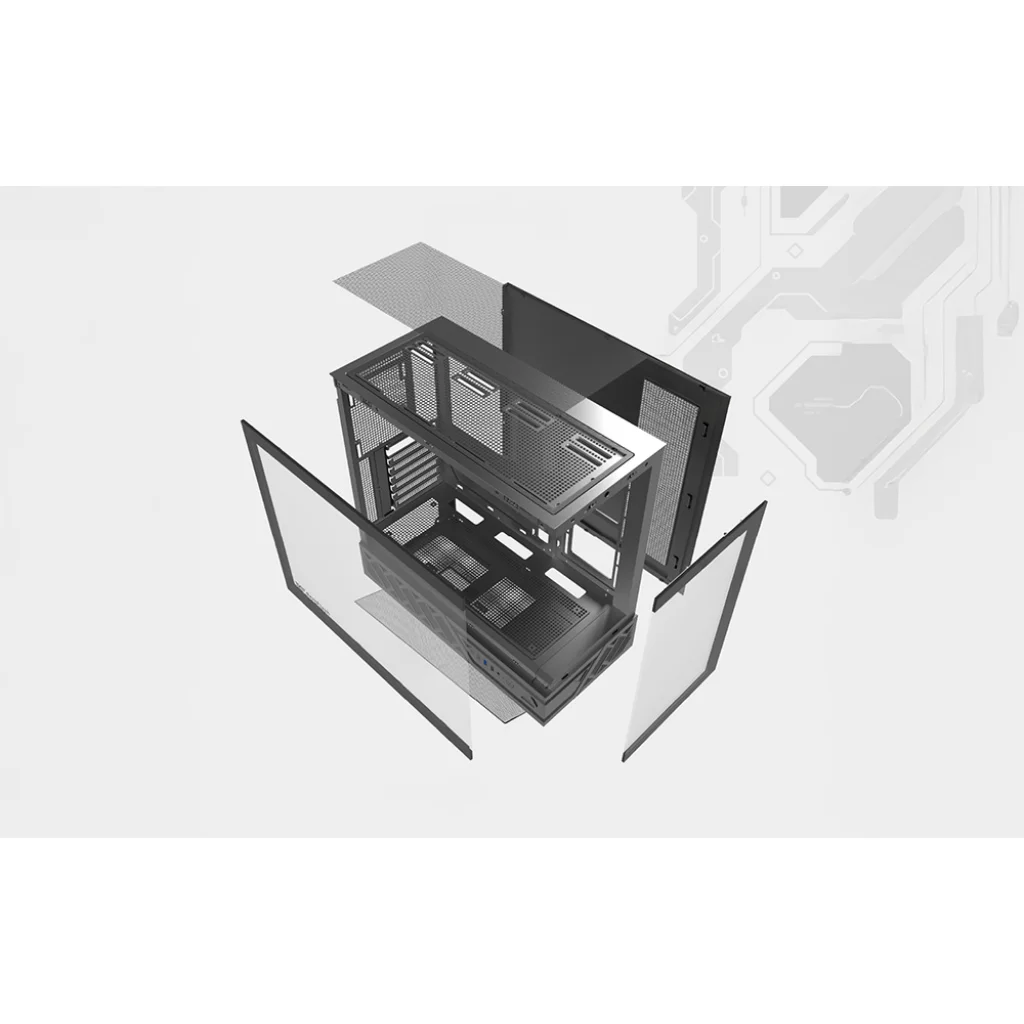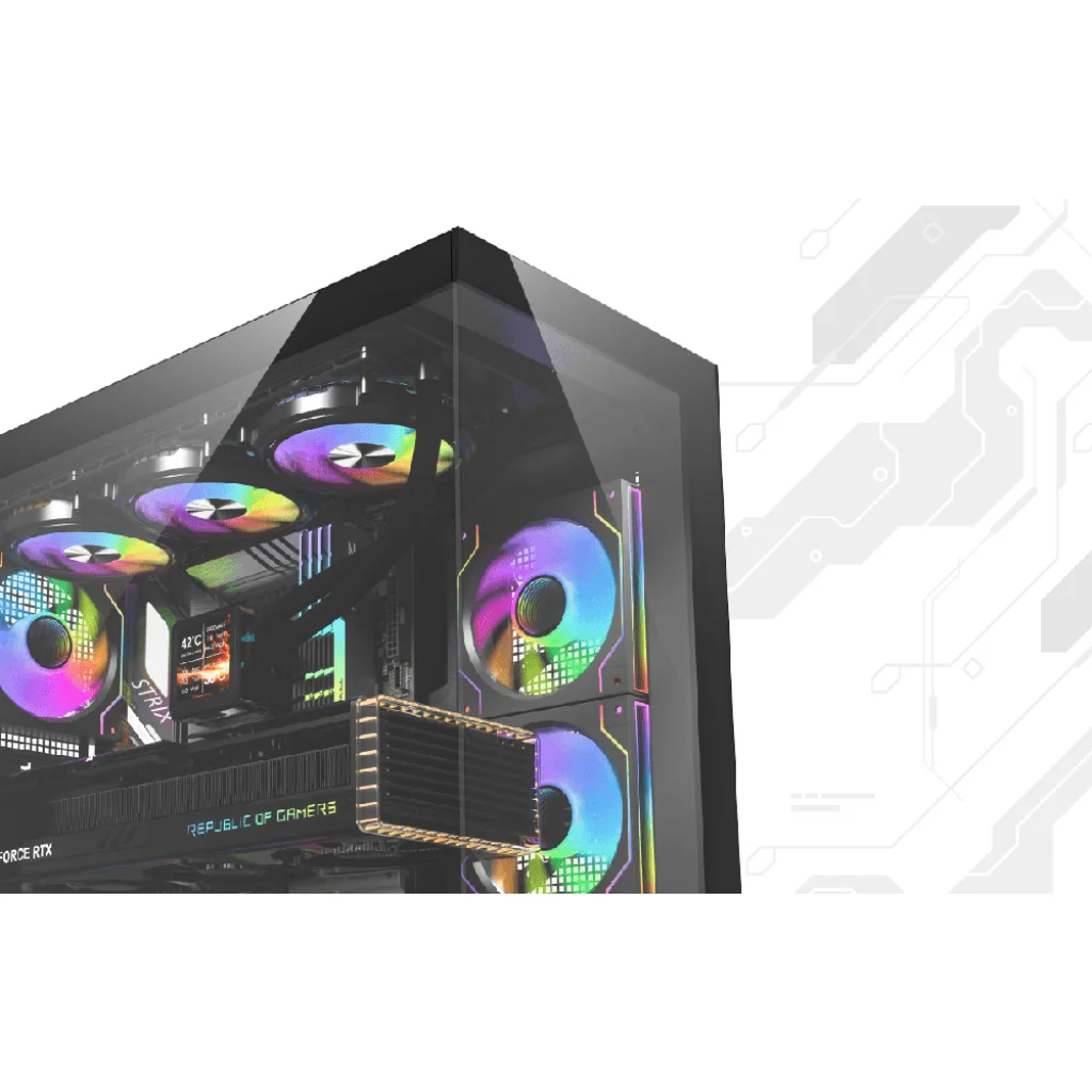 270°-os panorámás kialakítás A ház két átlátszó panellel rendelkezik, amelyeknek nincs függőleges profilja, így széles kilátást biztosítanak az alkatrészekre. Ez a kialakítás érdekes vizuális effektusokat tesz lehetővé – például bemutathatja az RGB ventilátorokat vagy a vízhűtést egy kijelzővel. Adjon egyedi karaktert a számítógépének!
