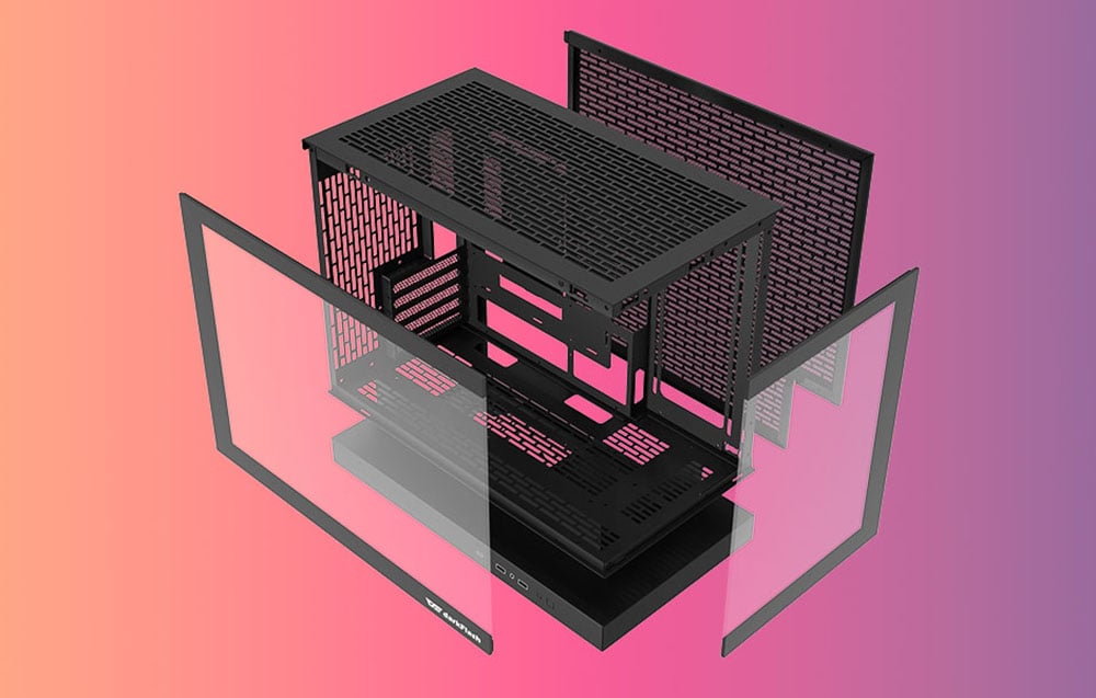 A ház kiváló minőségű, 0,8 mm vastagságú SPCC acélból készült, amely garantálja a tartósságot és a stabilitást. Emellett edzett üveglapok teszik láthatóvá a belső teret, és az egész egység rendkívül modernnek tűnik - ez a megoldás remekül mutat a játékosok asztalán és azon túl is.
