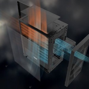 A csavarral rögzíthető edzett üvegből készült oldalsó panel lehetővé teszi a gyors hozzáférést a számítógép belsejéhez. Az átlátszó panel remekül használható a háttérvilágítással ellátott alkatrészekhez.